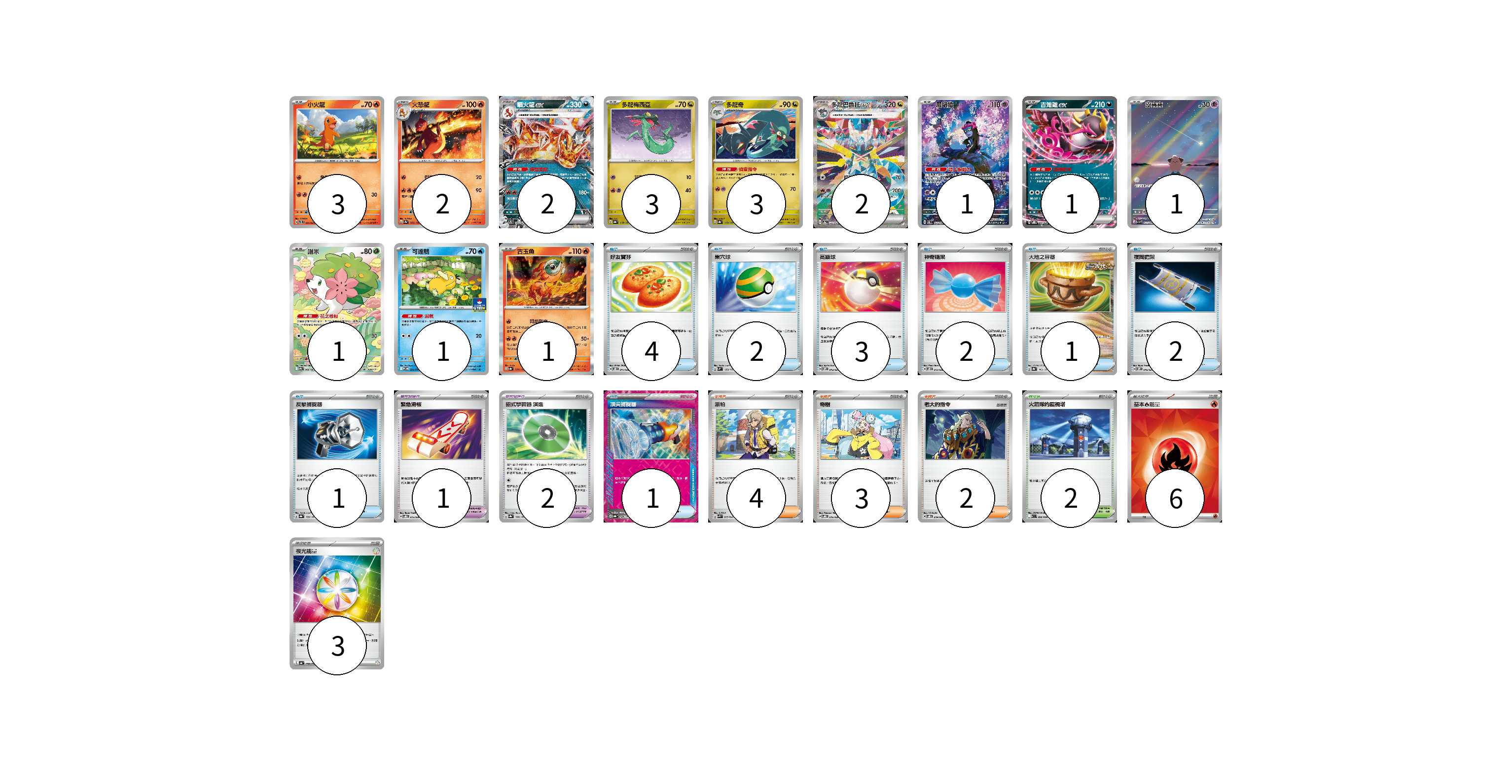 牌組構築方案 以此牌組為基礎新構築牌組 顯示卡面 顯示列表 寶可夢卡(21) 3 2 2 3 3 2 1 1 1 1 1 1 寶可夢道具(3) 1 2 物品卡(16) 4 2 3 2 1 2 1 1 支援者卡(9) 4 3 2 競技場卡(2) 2 能量卡(9) 6 3 寶可夢卡(21) 卡牌名稱 張數 卡牌名稱 張數 小火龍 SVTL 001/021 03 火恐龍 SV2a 005/165 02 噴火龍ex SVTL 006/021 02 多龍梅西亞 SV8a 118/187 03 多龍奇 SV8a 119/187 03 多龍巴魯托ex SV8a 221/187 02 願增猿 SV6 107/101 01 吉雉雞ex SVOD 004/020 01 皮寶寶 SV3 113/108 01 謝米 SV9a 066/063 01 可達鴨 SV-P 220/SV-P 01 古玉魚 SV8a 025/187 01 寶可夢道具(3) 卡牌名稱 張數 卡牌名稱 張數 緊急滑板 SVOD 015/020 01 招式學習器 演進 SV8a 160/187 02 物品卡(16) 卡牌名稱 張數 卡牌名稱 張數 好友寶芬 SVOD 011/020 04 巢穴球 SVM 133/175 02 高級球 SVOM 013/021 03 神奇糖果 SVOD 013/020 02 大地之容器 SV8a 143/187 01 夜間擔架 SVOM 016/021 02 反擊捕捉器 SV8a 139/187 01 頂尖捕捉器 SV8a 148/187 01 支援者卡(9) 卡牌名稱 張數 卡牌名稱 張數 派帕 SVK 035/042 04 奇樹 SVOD 016/020 03 老大的指令 SVOD 019/020 02 競技場卡(2) 卡牌名稱 張數 卡牌名稱 張數 火箭隊的監視塔 SV10 096/098 02 能量卡(9) 卡牌名稱 張數 卡牌名稱 張數 基本【火】能量 SVK FIR 06 夜光能量 SV4a 190/190 03 以此牌組為基礎新構築牌組 牌組編碼 zHKtax-uhQlyS-ecUHGW copy 列印牌組單 牌組編碼已複製 分享至SNS