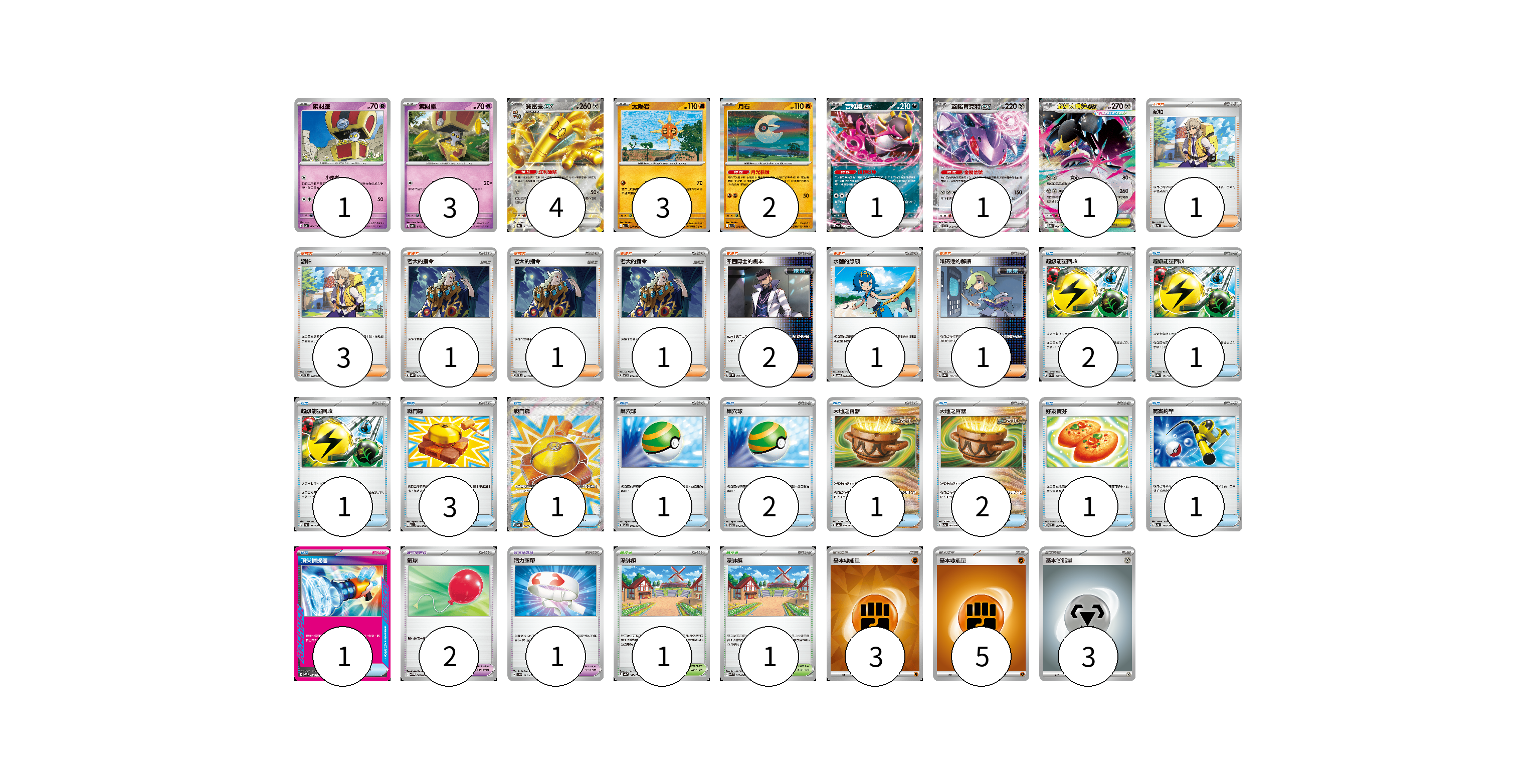 牌組構築方案 以此牌組為基礎新構築牌組 顯示卡面 顯示列表 寶可夢卡(16) 1 3 4 3 2 1 1 1 寶可夢道具(3) 2 1 物品卡(17) 2 1 1 3 1 1 2 1 2 1 1 1 支援者卡(11) 1 3 1 1 1 2 1 1 競技場卡(2) 1 1 能量卡(11) 3 5 3 寶可夢卡(16) 卡牌名稱 張數 卡牌名稱 張數 索財靈 SV7a 024/064 01 索財靈 SV8a 073/187 03 賽富豪ex SV8a 117/187 04 太陽岩 M1L 027/063 03 月石 M1L 026/063 02 吉雉雞ex SV6a 038/064 01 蓋諾賽克特ex SV11B 069/086 01 超級大嘴娃ex M1L 046/063 01 寶可夢道具(3) 卡牌名稱 張數 卡牌名稱 張數 氣球 SV11B 082/086 02 活力頭帶 SVD 125/139 01 物品卡(17) 卡牌名稱 張數 卡牌名稱 張數 超級能量回收 SVK 010/042 02 超級能量回收 SV8a 141/187 01 超級能量回收 SV4a 157/190 01 戰鬥鑼 M1L 059/063 03 戰鬥鑼 M1L 082/063 01 巢穴球 SVTL 011/021 01 巢穴球 SVTS 013/022 02 大地之容器 SVHK 011/022 01 大地之容器 SV4K 060/066 02 好友寶芬 SVTS 012/022 01 厲害釣竿 SV4a 158/190 01 頂尖捕捉器 MBG 014/022 01 支援者卡(11) 卡牌名稱 張數 卡牌名稱 張數 派帕 SV4a 180/190 01 派帕 SVTL 020/021 03 老大的指令 SVHK 022/022 01 老大的指令 SVTL 021/021 01 老大的指令 SVTR 019/021 01 弗圖博士的劇本 SV4M 065/066 02 水蓮的照顧 SV5a 064/066 01 暗碼迷的解讀 SV8a 165/187 01 競技場卡(2) 卡牌名稱 張數 卡牌名稱 張數 深缽鎮 SV4a 185/190 01 深缽鎮 SVK 039/042 01 能量卡(11) 卡牌名稱 張數 卡牌名稱 張數 基本【鬥】能量 SVM FIG 03 基本【鬥】能量 SVHK FIG 05 基本【鋼】能量 SVF MET 03 以此牌組為基礎新構築牌組 牌組編碼 zINHes-uwBgAr-kCIFAq copy 列印牌組單 牌組編碼已複製 分享至SNS