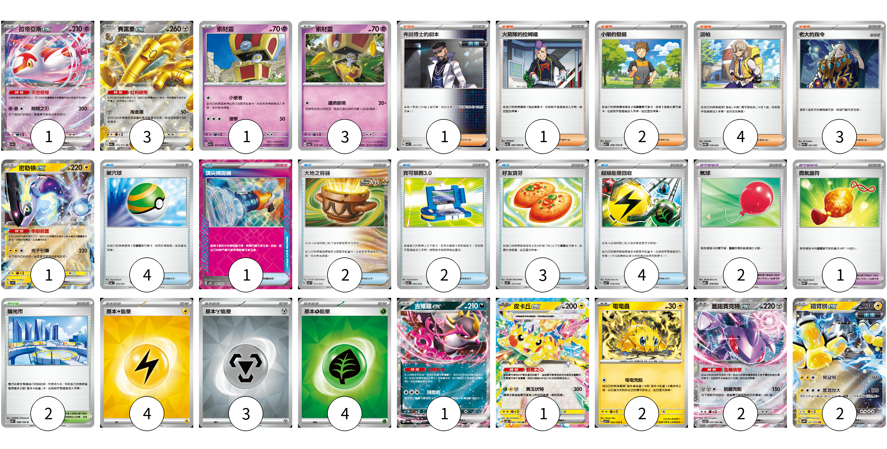 牌組構築方案 以此牌組為基礎新構築牌組 顯示卡面 顯示列表 寶可夢卡(17) 1 3 1 3 1 1 1 2 2 2 寶可夢道具(1) 1 物品卡(18) 4 1 2 2 3 4 2 支援者卡(11) 1 1 2 4 3 競技場卡(2) 2 能量卡(11) 4 3 4 寶可夢卡(17) 卡牌名稱 張數 卡牌名稱 張數 拉帝亞斯ex SV7a 019/064 01 賽富豪ex SV3a 050/062 03 索財靈 SV7a 024/064 01 索財靈 SV8a 073/187 03 密勒頓ex SV1V 037/078 01 吉雉雞ex SV8a 104/187 01 皮卡丘ex SV8 033/106 01 電電蟲 SV7 032/102 02 蓋諾賽克特ex SV11B 069/086 02 鐵臂膀ex SV4M 027/066 02 寶可夢道具(1) 卡牌名稱 張數 卡牌名稱 張數 勇氣護符 SVTS 017/022 01 物品卡(18) 卡牌名稱 張數 卡牌名稱 張數 巢穴球 SVAL 012/021 04 頂尖捕捉器 SV5M 062/071 01 大地之容器 SVK 012/042 02 寶可裝置3.0 SVB 004/028 02 好友寶芬 SVK 015/042 03 超級能量回收 SVK 010/042 04 氣球 MBD 018/022 02 支援者卡(11) 卡牌名稱 張數 卡牌名稱 張數 弗圖博士的劇本 SVK 034/042 01 火箭隊的拉姆達 SV10 094/098 01 小剛的發掘 SV9 096/100 02 派帕 SVTM 019/022 04 老大的指令 SVTL 021/021 03 競技場卡(2) 卡牌名稱 張數 卡牌名稱 張數 釀光市 SV9 098/100 02 能量卡(11) 卡牌名稱 張數 卡牌名稱 張數 基本【雷】能量 SVK LIG 04 基本【鋼】能量 SVOD MET 03 基本【草】能量 SVK GRA 04 以此牌組為基礎新構築牌組 牌組編碼 zIXaUT-yupLPC-sPVvaB copy 列印牌組單 牌組編碼已複製 分享至SNS