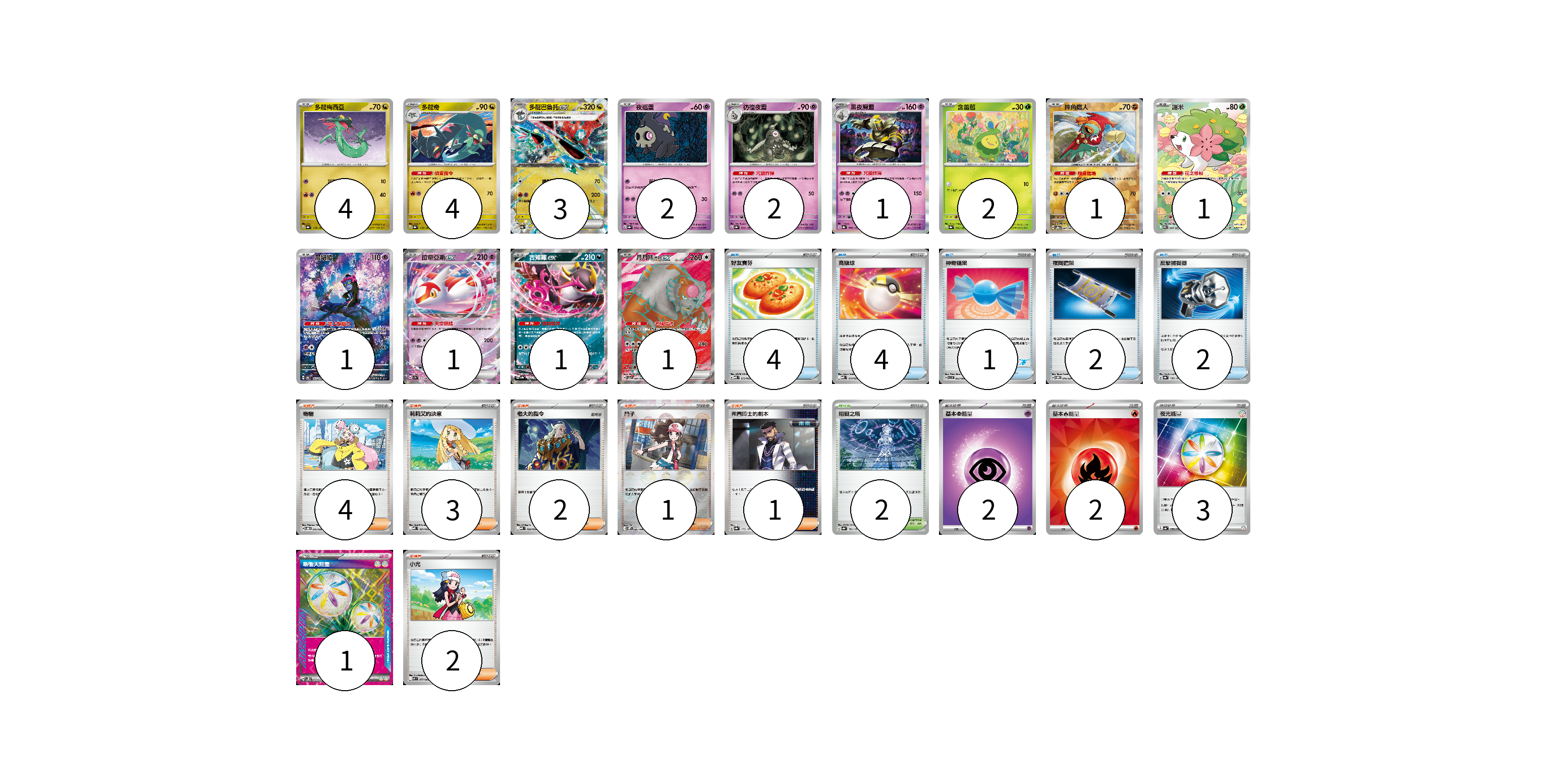 牌組構築方案 以此牌組為基礎新構築牌組 顯示卡面 顯示列表 寶可夢卡(24) 4 4 3 2 2 1 2 1 1 1 1 1 1 物品卡(13) 4 4 1 2 2 支援者卡(13) 4 3 2 1 1 2 競技場卡(2) 2 能量卡(8) 2 2 3 1 寶可夢卡(24) 卡牌名稱 張數 卡牌名稱 張數 多龍梅西亞 SV8a 118/187 04 多龍奇 SV8a 119/187 04 多龍巴魯托ex SV8a 120/187 03 夜巡靈 SV8a 064/187 02 彷徨夜靈 SV8a 065/187 02 黑夜魔靈 SV8a 066/187 01 含羞苞 SV8a 001/187 02 摔角鷹人 SV8a 084/187 01 謝米 SV9a 066/063 01 願增猿 SV6 107/101 01 拉帝亞斯ex SV7a 019/064 01 吉雉雞ex SV8a 104/187 01 月月熊 赫月 ex SV5a 084/066 01 物品卡(13) 卡牌名稱 張數 卡牌名稱 張數 好友寶芬 MBD 013/022 04 高級球 MBD 014/022 04 神奇糖果 SVI 053/066 01 夜間擔架 SVOM 016/021 02 反擊捕捉器 SV8a 139/187 02 支援者卡(13) 卡牌名稱 張數 卡牌名稱 張數 奇樹 SVOD 016/020 04 莉莉艾的決意 MBD 021/022 03 老大的指令 MBD 020/022 02 鬥子 SV11W 085/086 01 弗圖博士的劇本 SV8a 175/187 01 小光 M2 077/080 02 競技場卡(2) 卡牌名稱 張數 卡牌名稱 張數 阻礙之塔 SV8a 181/187 02 能量卡(8) 卡牌名稱 張數 卡牌名稱 張數 基本【超】能量 MBD PSY 02 基本【火】能量 SVQL FIR 02 夜光能量 SV4a 190/190 03 新衝天能量 SV5K 071/071 01 以此牌組為基礎新構築牌組 牌組編碼 zKBUBH-xmwCMo-ehHmUz copy 列印牌組單 牌組編碼已複製 分享至SNS
