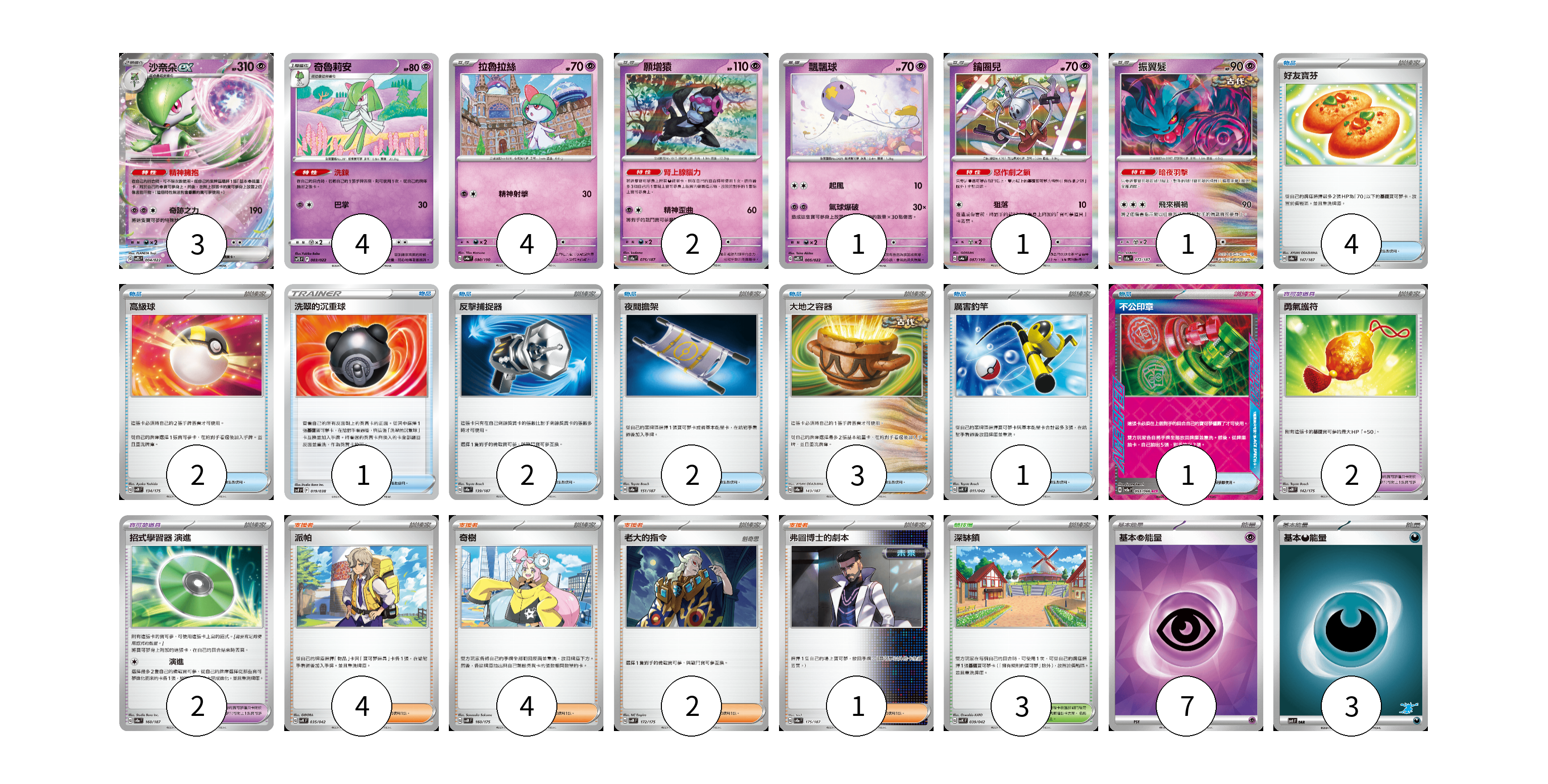 牌組構築方案 以此牌組為基礎新構築牌組 顯示卡面 顯示列表 寶可夢卡(16) 3 4 4 2 1 1 1 寶可夢道具(4) 2 2 物品卡(16) 4 2 1 2 2 3 1 1 支援者卡(11) 4 4 2 1 競技場卡(3) 3 能量卡(10) 7 3 寶可夢卡(16) 卡牌名稱 張數 卡牌名稱 張數 沙奈朵ex SVTS 004/022 03 奇魯莉安 SVTS 003/022 04 拉魯拉絲 SV4a 080/190 04 願增猿 SV8a 075/187 02 飄飄球 SVTS 005/022 01 鑰圈兒 SV4a 087/190 01 振翼髮 SV8a 072/187 01 寶可夢道具(4) 卡牌名稱 張數 卡牌名稱 張數 勇氣護符 SVM 142/175 02 招式學習器 演進 SV8a 160/187 02 物品卡(16) 卡牌名稱 張數 卡牌名稱 張數 好友寶芬 SV8a 147/187 04 高級球 SVM 134/175 02 洗翠的沉重球 SVF 019/038 01 反擊捕捉器 SV8a 139/187 02 夜間擔架 SV8a 151/187 02 大地之容器 SV8a 143/187 03 厲害釣竿 SVK 011/042 01 不公印章 SV5a 053/066 01 支援者卡(11) 卡牌名稱 張數 卡牌名稱 張數 派帕 SVK 035/042 04 奇樹 SVM 160/175 04 老大的指令 SVM 172/175 02 弗圖博士的劇本 SV8a 175/187 01 競技場卡(3) 卡牌名稱 張數 卡牌名稱 張數 深缽鎮 SVK 039/042 03 能量卡(10) 卡牌名稱 張數 卡牌名稱 張數 基本【超】能量 SVK PSY 07 基本【惡】能量 SVI DAR 03 以此牌組為基礎新構築牌組 牌組編碼 zOiuVB-lzYPWK-CZykha copy 列印牌組單 牌組編碼已複製 分享至SNS