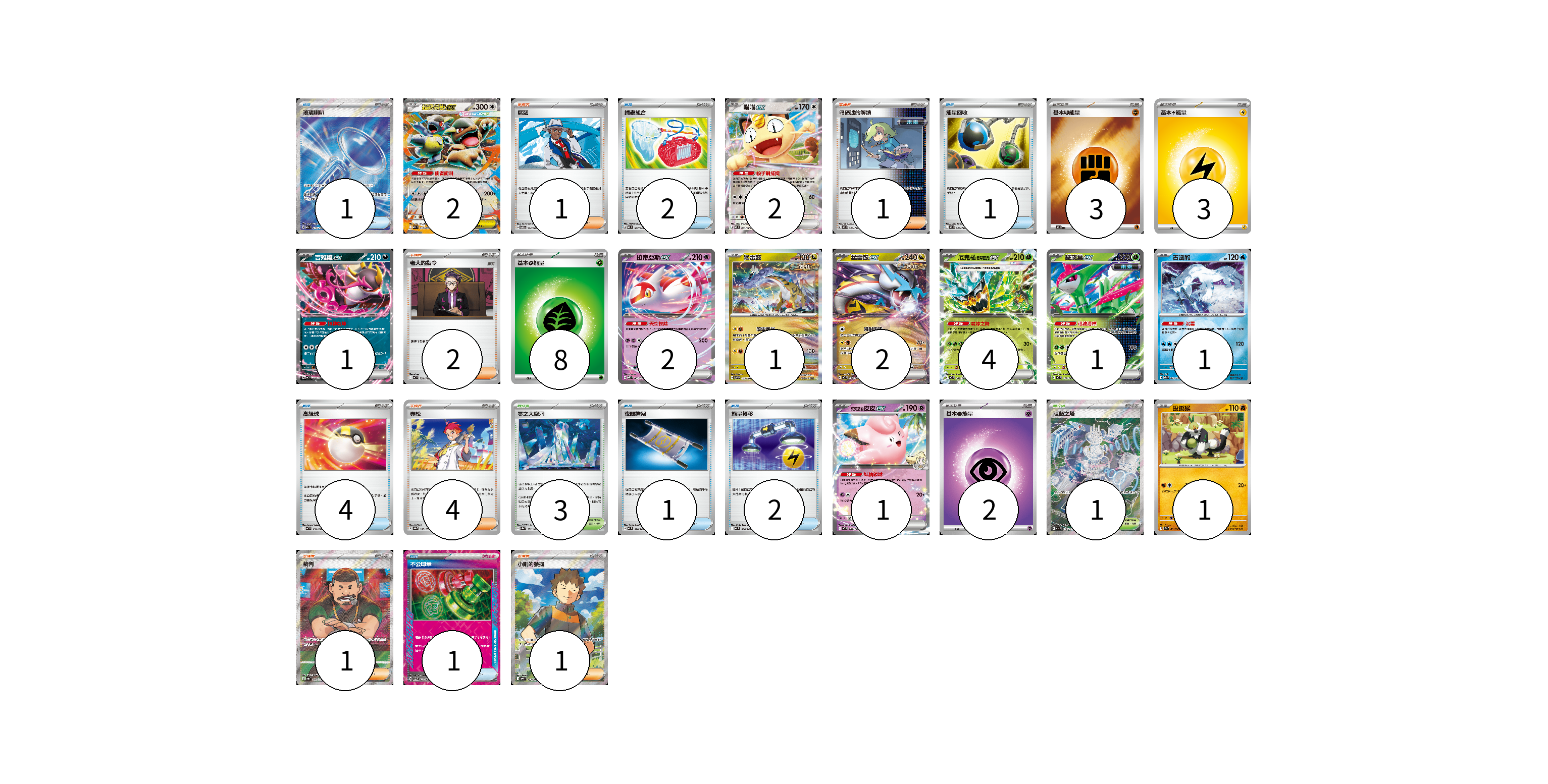 牌組構築方案 以此牌組為基礎新構築牌組 顯示卡面 顯示列表 寶可夢卡(18) 2 2 1 2 1 2 4 1 1 1 1 物品卡(12) 1 2 1 4 1 2 1 支援者卡(10) 1 1 2 4 1 1 競技場卡(4) 3 1 能量卡(16) 3 3 8 2 寶可夢卡(18) 卡牌名稱 張數 卡牌名稱 張數 超級袋獸ex M1S 051/063 02 喵喵ex M3 061/080 02 吉雉雞ex MC 489/742 01 拉帝亞斯ex MBD 003/022 02 猛雷鼓 SV7 075/102 01 猛雷鼓ex MC 554/742 02 厄鬼椪 碧草面具ex MC 082/742 04 鐵斑葉ex MC 077/742 01 古劍豹 M2a 043/193 01 莉莉艾的皮皮ex MC 287/742 01 投擲猴 SV7a 031/064 01 物品卡(12) 卡牌名稱 張數 卡牌名稱 張數 玻璃喇叭 M2a 215/193 01 捕蟲組合 MC 667/742 02 能量回收 MC 636/742 01 高級球 MC 651/742 04 夜間擔架 MC 670/742 01 能量轉移 MC 638/742 02 不公印章 SV5a 053/066 01 支援者卡(10) 卡牌名稱 張數 卡牌名稱 張數 席藍 SV8 102/106 01 暗碼迷的解讀 MC 698/742 01 老大的指令 MC 724/742 02 赤松 SV8a 163/187 04 裁判 SV4a 342/190 01 小剛的發掘 SV9 123/100 01 競技場卡(4) 卡牌名稱 張數 卡牌名稱 張數 零之大空洞 SV8a 182/187 03 阻礙之塔 M2a 222/193 01 能量卡(16) 卡牌名稱 張數 卡牌名稱 張數 基本【鬥】能量 MC FIG 03 基本【雷】能量 MJ LIG 03 基本【草】能量 MJ GRA 08 基本【超】能量 MC PSY 02 以此牌組為基礎新構築牌組 牌組編碼 zRznbr-jpPBTP-BqrNNS copy 列印牌組單 牌組編碼已複製 分享至SNS