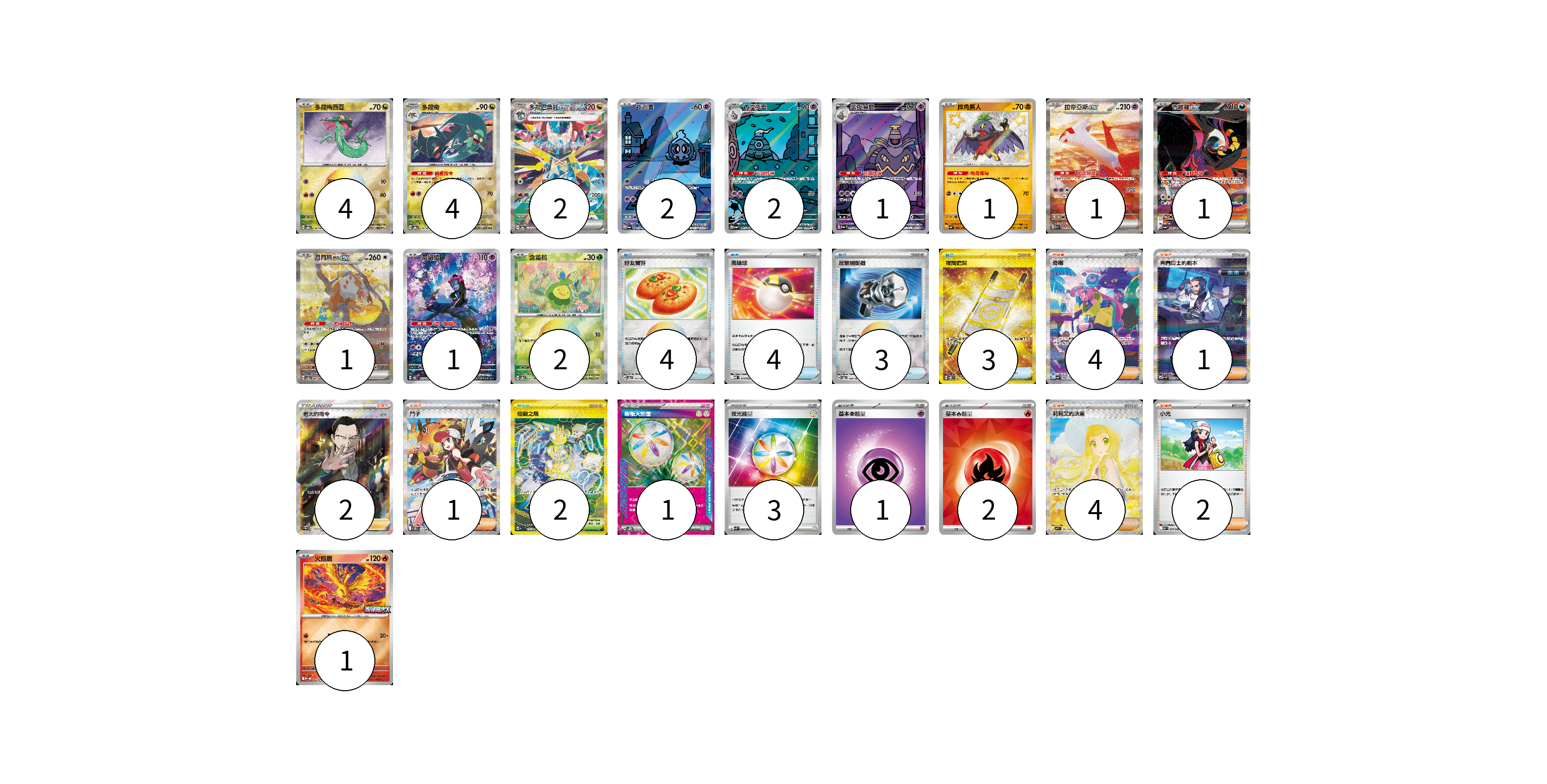 牌組構築方案 以此牌組為基礎新構築牌組 顯示卡面 顯示列表 寶可夢卡(23) 4 4 2 2 2 1 1 1 1 1 1 2 1 物品卡(14) 4 4 3 3 支援者卡(14) 4 1 2 1 4 2 競技場卡(2) 2 能量卡(7) 1 3 1 2 寶可夢卡(23) 卡牌名稱 張數 卡牌名稱 張數 多龍梅西亞 SV8a 118/187 04 多龍奇 SV8a 119/187 04 多龍巴魯托ex SV8a 221/187 02 夜巡靈 SV6a 068/064 02 彷徨夜靈 SV6a 069/064 02 黑夜魔靈 SV6a 070/064 01 摔角鷹人 SV4a 282/190 01 拉帝亞斯ex SV7a 087/064 01 吉雉雞ex SV6a 089/064 01 月月熊 赫月 ex SV5a 091/066 01 願增猿 SV6 107/101 01 含羞苞 SV8a 001/187 02 火焰鳥 M-P 022/M-P 01 物品卡(14) 卡牌名稱 張數 卡牌名稱 張數 好友寶芬 SV8a 147/187 04 高級球 MBD 014/022 04 反擊捕捉器 SV8a 139/187 03 夜間擔架 SV8 137/106 03 支援者卡(14) 卡牌名稱 張數 卡牌名稱 張數 奇樹 SV4a 350/190 04 弗圖博士的劇本 SV4M 091/066 01 老大的指令(坂木) SC1b 170/153 02 鬥子 SV11W 173/086 01 莉莉艾的決意 M1L 091/063 04 小光 M2 077/080 02 競技場卡(2) 卡牌名稱 張數 卡牌名稱 張數 阻礙之塔 SV10 132/098 02 能量卡(7) 卡牌名稱 張數 卡牌名稱 張數 新衝天能量 SV5K 071/071 01 夜光能量 SVK 042/042 03 基本【超】能量 M-P PSY 01 基本【火】能量 SVQL FIR 02 以此牌組為基礎新構築牌組 牌組編碼 zSVZEh-FWzjgx-irXEtP copy 列印牌組單 牌組編碼已複製 分享至SNS