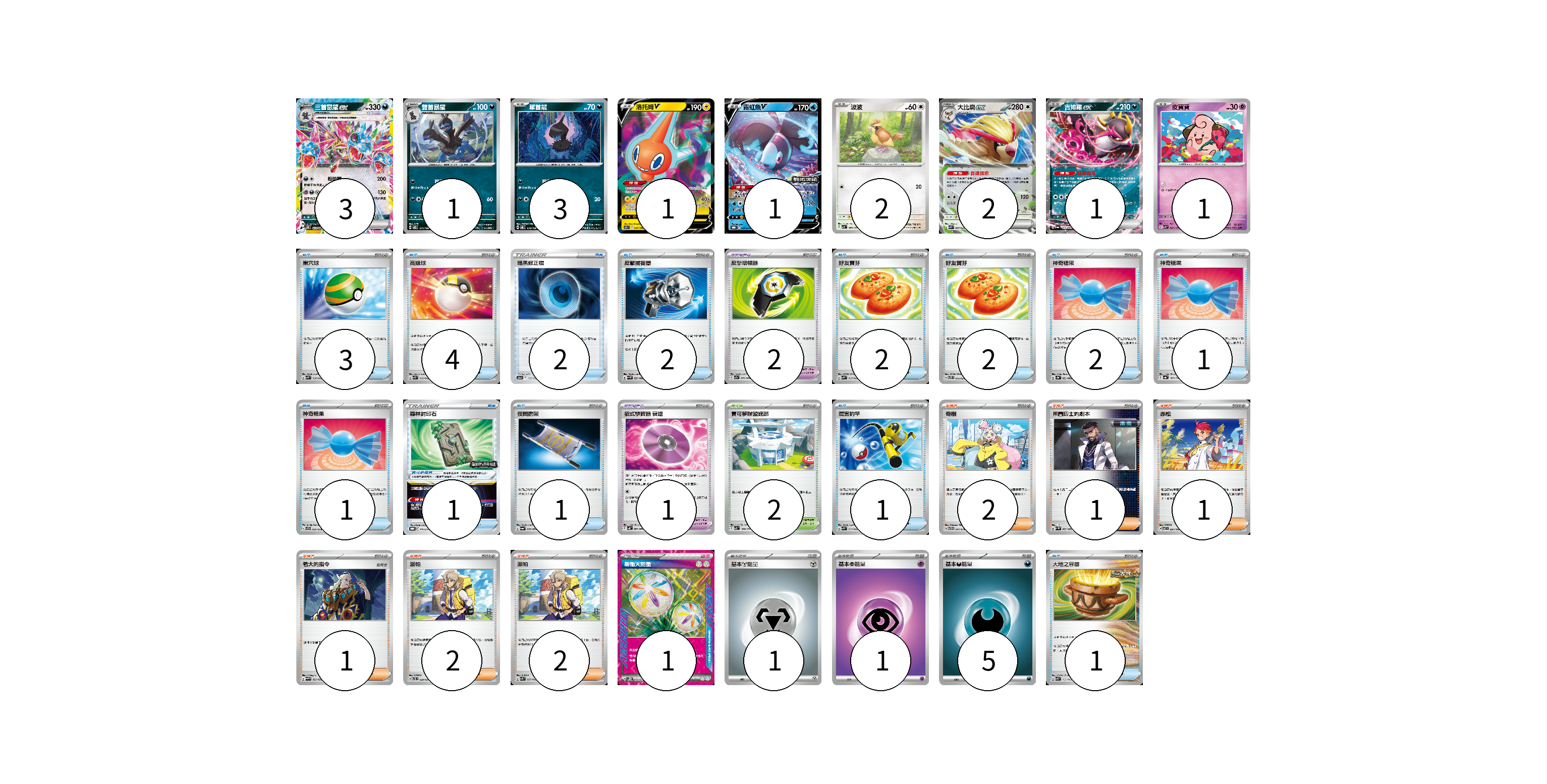 牌組構築方案 以此牌組為基礎新構築牌組 顯示卡面 顯示列表 寶可夢卡(15) 3 1 3 1 1 2 2 1 1 寶可夢道具(4) 2 1 1 物品卡(22) 3 4 2 2 2 2 2 1 1 1 1 1 支援者卡(9) 2 1 1 1 2 2 競技場卡(2) 2 能量卡(8) 1 1 1 5 寶可夢卡(15) 卡牌名稱 張數 卡牌名稱 張數 三首惡龍ex SV8 072/106 03 雙首暴龍 SV8 071/106 01 單首龍 SV8 070/106 03 洛托姆V S11 037/100 01 霓虹魚V SV-P 134/SV-P 01 波波 SV3 087/108 02 大比鳥ex SVK 005/042 02 吉雉雞ex SV6a 038/064 01 皮寶寶 SV3 042/108 01 寶可夢道具(4) 卡牌名稱 張數 卡牌名稱 張數 反擊增幅器 SV7a 059/064 02 森林封印石 SV-P 141/SV-P 01 招式學習器 衰退 SV4K 063/066 01 物品卡(22) 卡牌名稱 張數 卡牌名稱 張數 巢穴球 SVK 016/042 03 高級球 SVK 018/042 04 暗黑修正檔 S12a 135/172 02 反擊捕捉器 SV4M 059/066 02 好友寶芬 SVK 015/042 02 好友寶芬 SVTS 012/022 02 神奇糖果 SV3a 053/062 02 神奇糖果 SV4a 163/190 01 神奇糖果 SVF 020/038 01 夜間擔架 SV6a 056/064 01 厲害釣竿 SVK 011/042 01 大地之容器 SVK 012/042 01 支援者卡(9) 卡牌名稱 張數 卡牌名稱 張數 奇樹 SVTG 017/019 02 弗圖博士的劇本 SV4M 065/066 01 赤松 SV7 097/102 01 老大的指令 SVHM 022/022 01 派帕 SVTL 020/021 02 派帕 SVK 035/042 02 競技場卡(2) 卡牌名稱 張數 卡牌名稱 張數 寶可夢聯盟總部 SV3 108/108 02 能量卡(8) 卡牌名稱 張數 卡牌名稱 張數 新衝天能量 SV5K 071/071 01 基本【鋼】能量 SVTH MET 01 基本【超】能量 SVD PSY 01 基本【惡】能量 SVF DAR 05 以此牌組為基礎新構築牌組 牌組編碼 zVXBET-gzWGmH-qMnuWv copy 列印牌組單 牌組編碼已複製 分享至SNS
