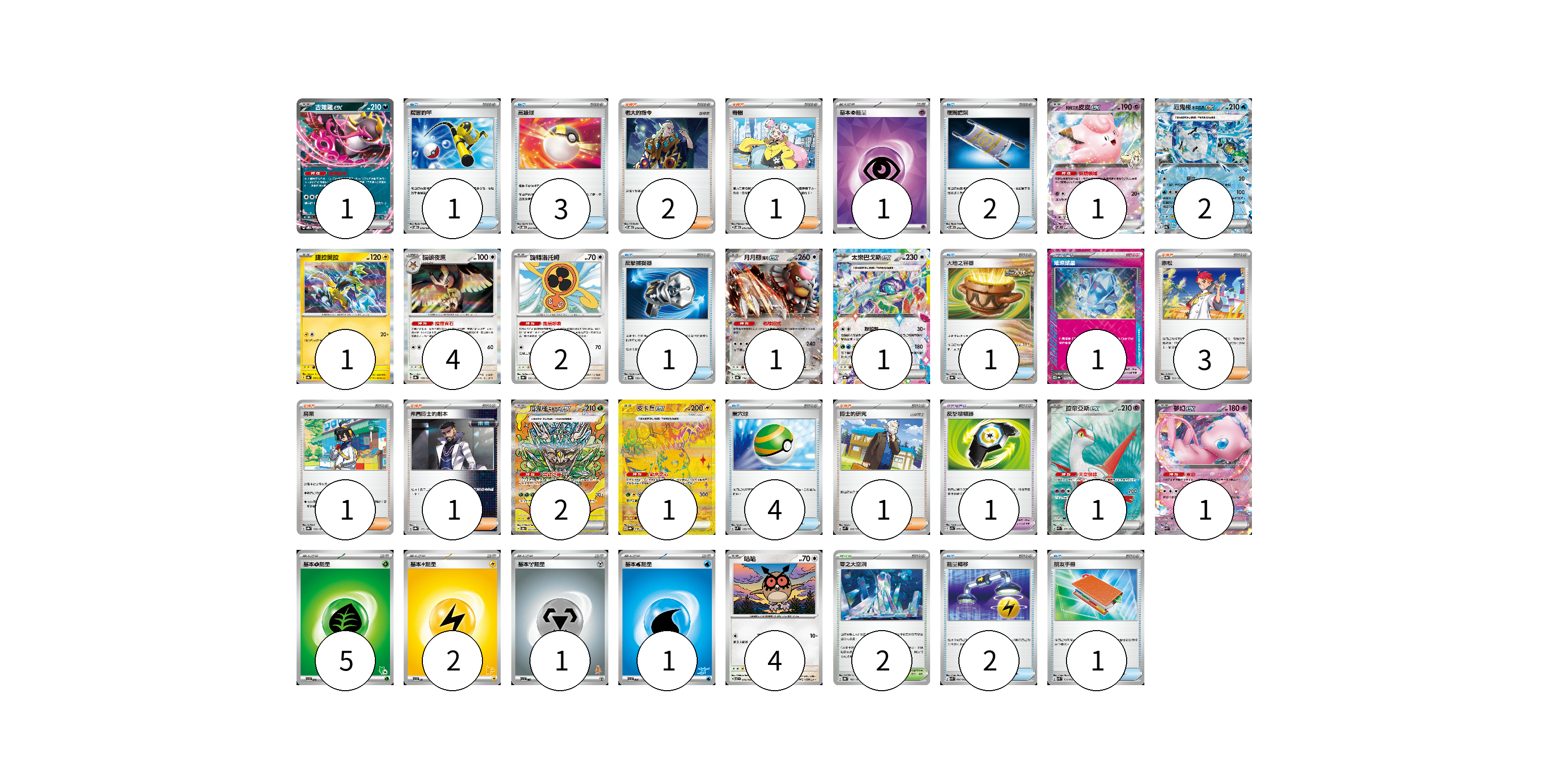 牌組構築方案 以此牌組為基礎新構築牌組 顯示卡面 顯示列表 寶可夢卡(22) 1 1 2 1 4 2 1 1 2 1 1 1 4 寶可夢道具(2) 1 1 物品卡(15) 1 3 2 1 1 4 2 1 支援者卡(9) 2 1 3 1 1 1 競技場卡(2) 2 能量卡(10) 1 5 2 1 1 寶可夢卡(22) 卡牌名稱 張數 卡牌名稱 張數 吉雉雞ex SVOD 004/020 01 莉莉艾的皮皮ex SV9 033/100 01 厄鬼椪 水井面具ex SV8a 050/187 02 捷拉奧拉 SV8a 053/187 01 貓頭夜鷹 SV8a 128/187 04 旋轉洛托姆 SV8a 131/187 02 月月熊 赫月ex SV8a 134/187 01 太樂巴戈斯ex SV8a 136/187 01 厄鬼椪 碧草面具ex SV8a 201/187 02 皮卡丘ex SV8a 236/187 01 拉帝亞斯ex SV7a 078/064 01 夢幻ex SVK 001/042 01 咕咕 SV7 076/102 04 寶可夢道具(2) 卡牌名稱 張數 卡牌名稱 張數 璀璨結晶 SV8a 152/187 01 反擊增幅器 SV7a 059/064 01 物品卡(15) 卡牌名稱 張數 卡牌名稱 張數 厲害釣竿 SVOD 010/020 01 高級球 SVOD 012/020 03 夜間擔架 SVOM 016/021 02 反擊捕捉器 SV8a 139/187 01 大地之容器 SV8a 143/187 01 巢穴球 SVM 133/175 04 能量轉移 SVK 008/042 02 朋友手冊 SVK 014/042 01 支援者卡(9) 卡牌名稱 張數 卡牌名稱 張數 老大的指令 SVOD 019/020 02 奇樹 SVOD 016/020 01 赤松 SV8a 163/187 03 烏栗 SV8a 169/187 01 弗圖博士的劇本 SV8a 175/187 01 博士的研究 SVM 165/175 01 競技場卡(2) 卡牌名稱 張數 卡牌名稱 張數 零之大空洞 SV8a 182/187 02 能量卡(10) 卡牌名稱 張數 卡牌名稱 張數 基本【超】能量 SVOD PSY 01 基本【草】能量 SVI GRA 05 基本【雷】能量 SVI LIG 02 基本【鋼】能量 SVI MET 01 基本【水】能量 SVI WAT 01 以此牌組為基礎新構築牌組 牌組編碼 zXHTfU-xzpVwD-DxUtBm copy 列印牌組單 牌組編碼已複製 分享至SNS