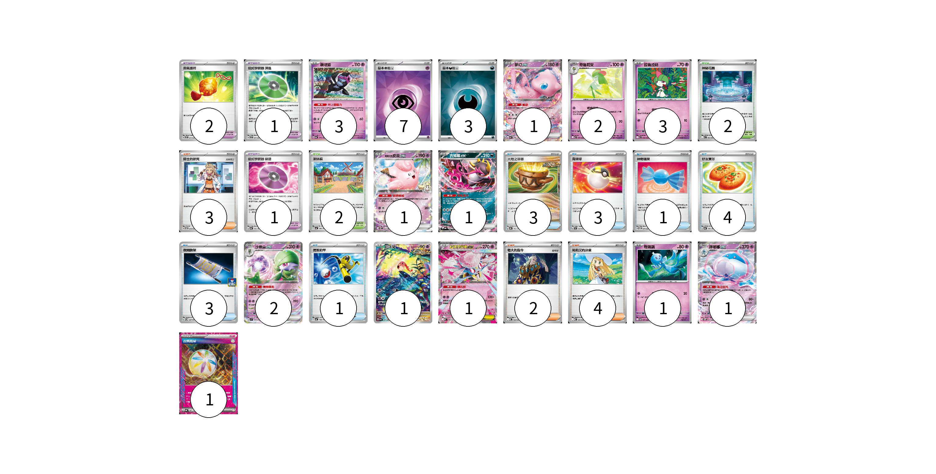 牌組構築方案 以此牌組為基礎新構築牌組 顯示卡面 顯示列表 寶可夢卡(17) 3 1 2 3 1 1 2 1 1 1 1 寶可夢道具(4) 2 1 1 物品卡(15) 3 3 1 4 3 1 支援者卡(9) 3 2 4 競技場卡(4) 2 2 能量卡(11) 7 3 1 寶可夢卡(17) 卡牌名稱 張數 卡牌名稱 張數 願增猿 SV8a 075/187 03 夢幻ex SV4a 076/190 01 奇魯莉安 M1S 041/063 02 拉魯拉絲 M1S 040/063 03 莉莉艾的皮皮ex SV9 033/100 01 吉雉雞ex SV8a 104/187 01 沙奈朵ex SV1S 028/078 02 吼叫尾 SV4K 071/066 01 超級蒂安希ex MBD 006/022 01 輕飄飄 SV11W 041/086 01 胖嘟嘟ex SV11W 042/086 01 寶可夢道具(4) 卡牌名稱 張數 卡牌名稱 張數 勇氣護符 SVTS 017/022 02 招式學習器 演進 SVTL 017/021 01 招式學習器 衰退 SV8a 161/187 01 物品卡(15) 卡牌名稱 張數 卡牌名稱 張數 大地之容器 SV8a 143/187 03 高級球 SVAM 016/023 03 神奇糖果 SVOM 014/021 01 好友寶芬 SV8a 147/187 04 夜間擔架 SV-P 227/SV-P 03 厲害釣竿 SV4a 158/190 01 支援者卡(9) 卡牌名稱 張數 卡牌名稱 張數 博士的研究 SVTM 018/022 03 老大的指令 MBD 020/022 02 莉莉艾的決意 MBD 021/022 04 競技場卡(4) 卡牌名稱 張數 卡牌名稱 張數 神秘花園 M1S 063/063 02 深缽鎮 SV4a 185/190 02 能量卡(11) 卡牌名稱 張數 卡牌名稱 張數 基本【超】能量 SVOD PSY 07 基本【惡】能量 SVOM DAR 03 古舊能量 SV8a 187/187 01 以此牌組為基礎新構築牌組 牌組編碼 zcilvL-qUzEAL-thuYOy copy 列印牌組單 牌組編碼已複製 分享至SNS