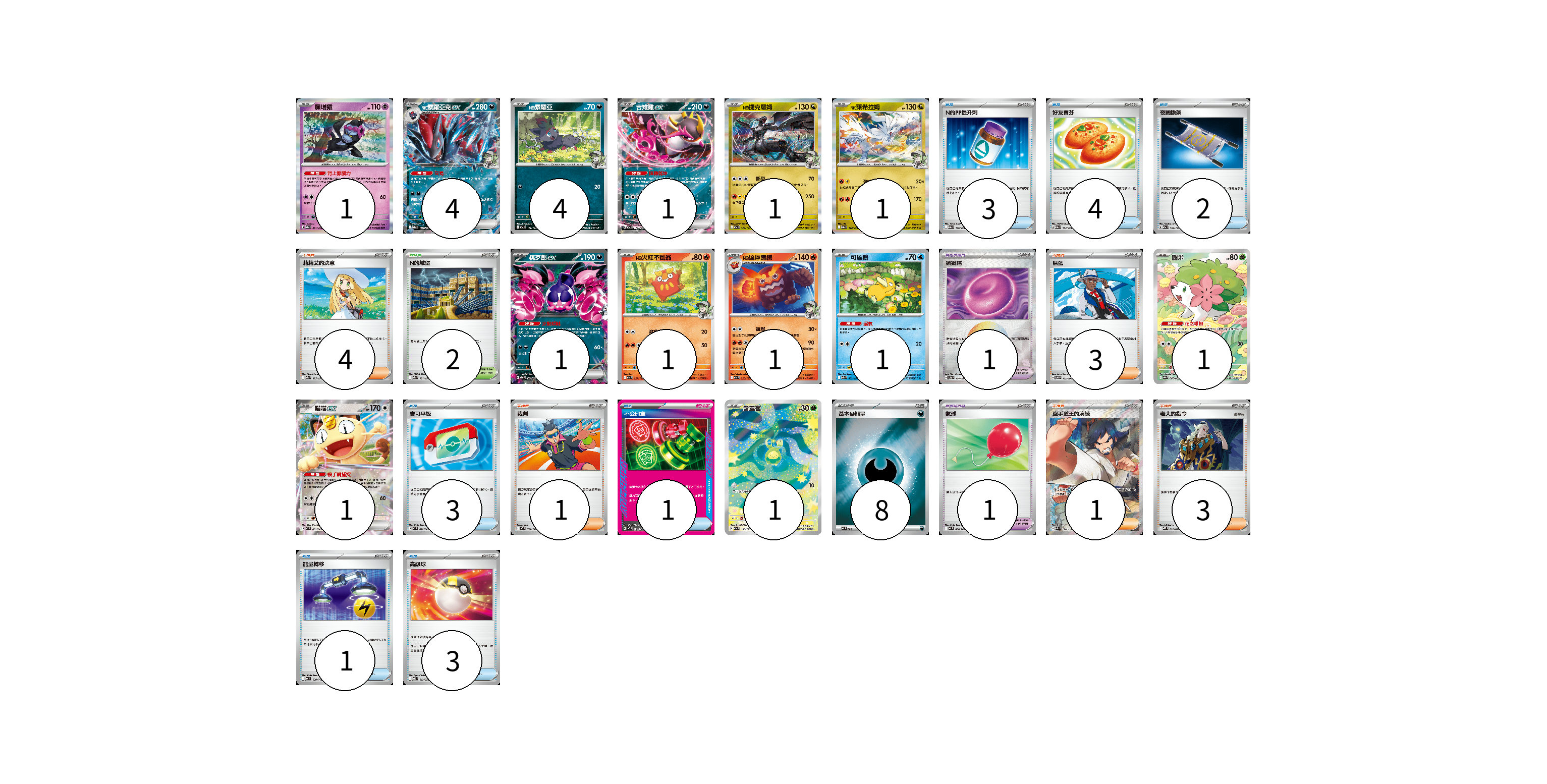牌組構築方案 以此牌組為基礎新構築牌組 顯示卡面 顯示列表 寶可夢卡(19) 1 4 4 1 1 1 1 1 1 1 1 1 1 寶可夢道具(2) 1 1 物品卡(17) 3 4 2 3 1 1 3 支援者卡(12) 4 3 1 1 3 競技場卡(2) 2 能量卡(8) 8 寶可夢卡(19) 卡牌名稱 張數 卡牌名稱 張數 願增猿 M2a 081/193 01 N的索羅亞克ex M2a 112/193 04 N的索羅亞 M2a 111/193 04 吉雉雞ex M2a 114/193 01 N的捷克羅姆 M2a 129/193 01 N的萊希拉姆 M2a 128/193 01 桃歹郎ex MBG 009/022 01 N的火紅不倒翁 M2a 027/193 01 N的達摩狒狒 M2a 028/193 01 可達鴨 M2a 032/193 01 謝米 SV9a 066/063 01 喵喵ex M3 061/080 01 含羞苞 M2a 196/193 01 寶可夢道具(2) 卡牌名稱 張數 卡牌名稱 張數 鎖鏈糬 SV8a 154/187 01 氣球 MC 688/742 01 物品卡(17) 卡牌名稱 張數 卡牌名稱 張數 N的PP提升劑 M2a 146/193 03 好友寶芬 M2a 153/193 04 夜間擔架 M2a 159/193 02 寶可平板 M3 070/080 03 不公印章 MC 633/742 01 能量轉移 MC 638/742 01 高級球 MBG 012/022 03 支援者卡(12) 卡牌名稱 張數 卡牌名稱 張數 莉莉艾的決意 M2a 175/193 04 席藍 SV8 102/106 03 裁判 MC 711/742 01 空手道王的演練 M2a 220/193 01 老大的指令 MBD 020/022 03 競技場卡(2) 卡牌名稱 張數 卡牌名稱 張數 N的城堡 M2a 181/193 02 能量卡(8) 卡牌名稱 張數 卡牌名稱 張數 基本【惡】能量 MC DAR 08 以此牌組為基礎新構築牌組 牌組編碼 zcylSj-SIDskT-hjreHb copy 列印牌組單 牌組編碼已複製 分享至SNS