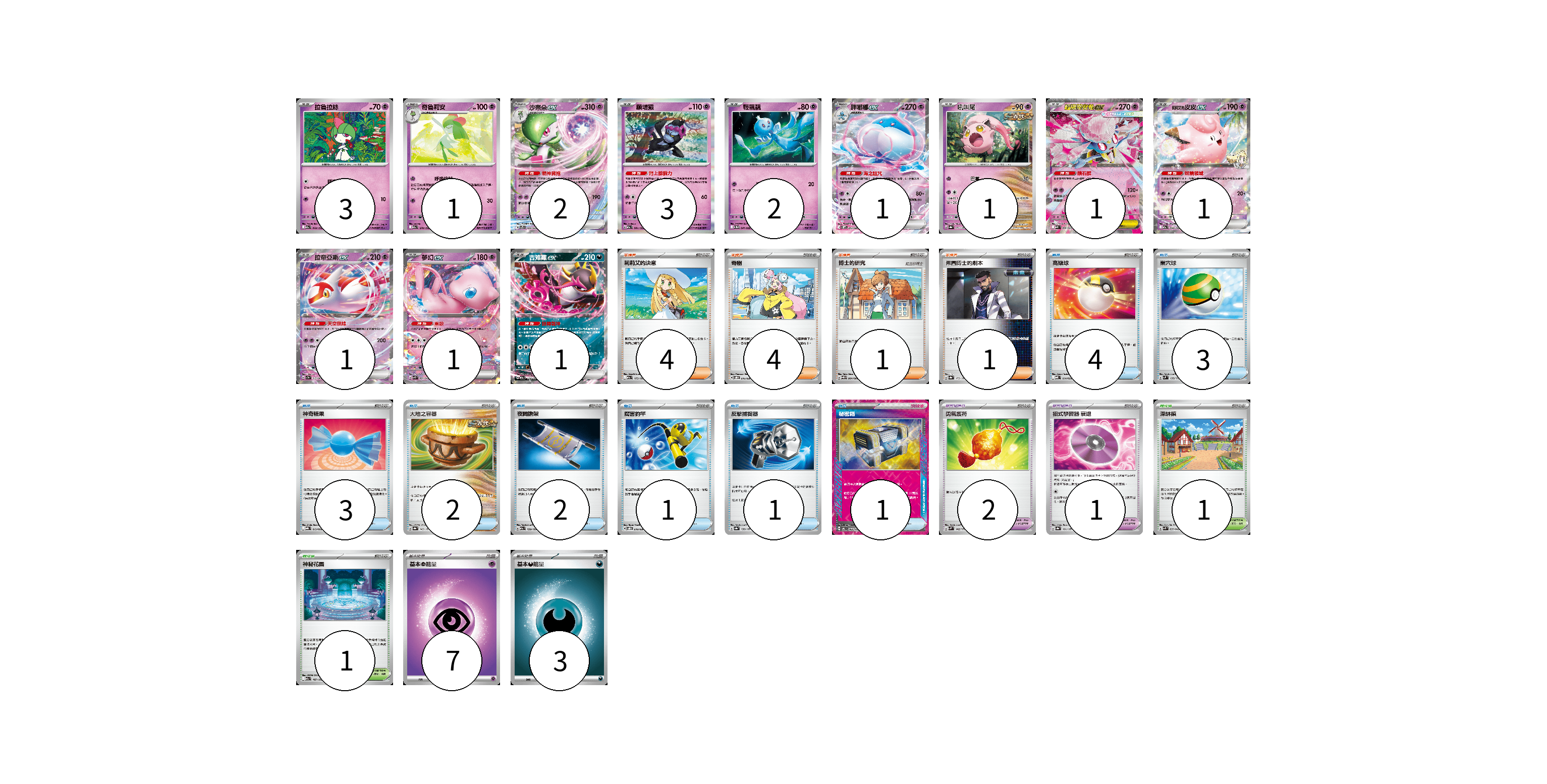 牌組構築方案 以此牌組為基礎新構築牌組 顯示卡面 顯示列表 寶可夢卡(18) 3 1 2 3 2 1 1 1 1 1 1 1 寶可夢道具(3) 2 1 物品卡(17) 4 3 3 2 2 1 1 1 支援者卡(10) 4 4 1 1 競技場卡(2) 1 1 能量卡(10) 7 3 寶可夢卡(18) 卡牌名稱 張數 卡牌名稱 張數 拉魯拉絲 M2a 069/193 03 奇魯莉安 M2a 070/193 01 沙奈朵ex SVTS 004/022 02 願增猿 M2a 081/193 03 輕飄飄 SV11W 041/086 02 胖嘟嘟ex SV11W 042/086 01 吼叫尾 SV8a 071/187 01 超級蒂安希ex MBD 006/022 01 莉莉艾的皮皮ex M2a 060/193 01 拉帝亞斯ex SV7a 019/064 01 夢幻ex SVK 001/042 01 吉雉雞ex M2a 114/193 01 寶可夢道具(3) 卡牌名稱 張數 卡牌名稱 張數 勇氣護符 SVM 142/175 02 招式學習器 衰退 SV8a 161/187 01 物品卡(17) 卡牌名稱 張數 卡牌名稱 張數 高級球 MBD 014/022 04 巢穴球 SVM 133/175 03 神奇糖果 MBG 013/022 03 大地之容器 SV8a 143/187 02 夜間擔架 M2a 159/193 02 厲害釣竿 SVOD 010/020 01 反擊捕捉器 SV8a 139/187 01 秘密箱 SV6 092/101 01 支援者卡(10) 卡牌名稱 張數 卡牌名稱 張數 莉莉艾的決意 M2a 175/193 04 奇樹 SVOD 016/020 04 博士的研究 SV11B 084/086 01 弗圖博士的劇本 SV8a 175/187 01 競技場卡(2) 卡牌名稱 張數 卡牌名稱 張數 深缽鎮 SVK 039/042 01 神秘花園 M2a 187/193 01 能量卡(10) 卡牌名稱 張數 卡牌名稱 張數 基本【超】能量 MBD PSY 07 基本【惡】能量 MBG DAR 03 以此牌組為基礎新構築牌組 牌組編碼 zgaMLo-vChWjz-czpdfK copy 列印牌組單 牌組編碼已複製 分享至SNS