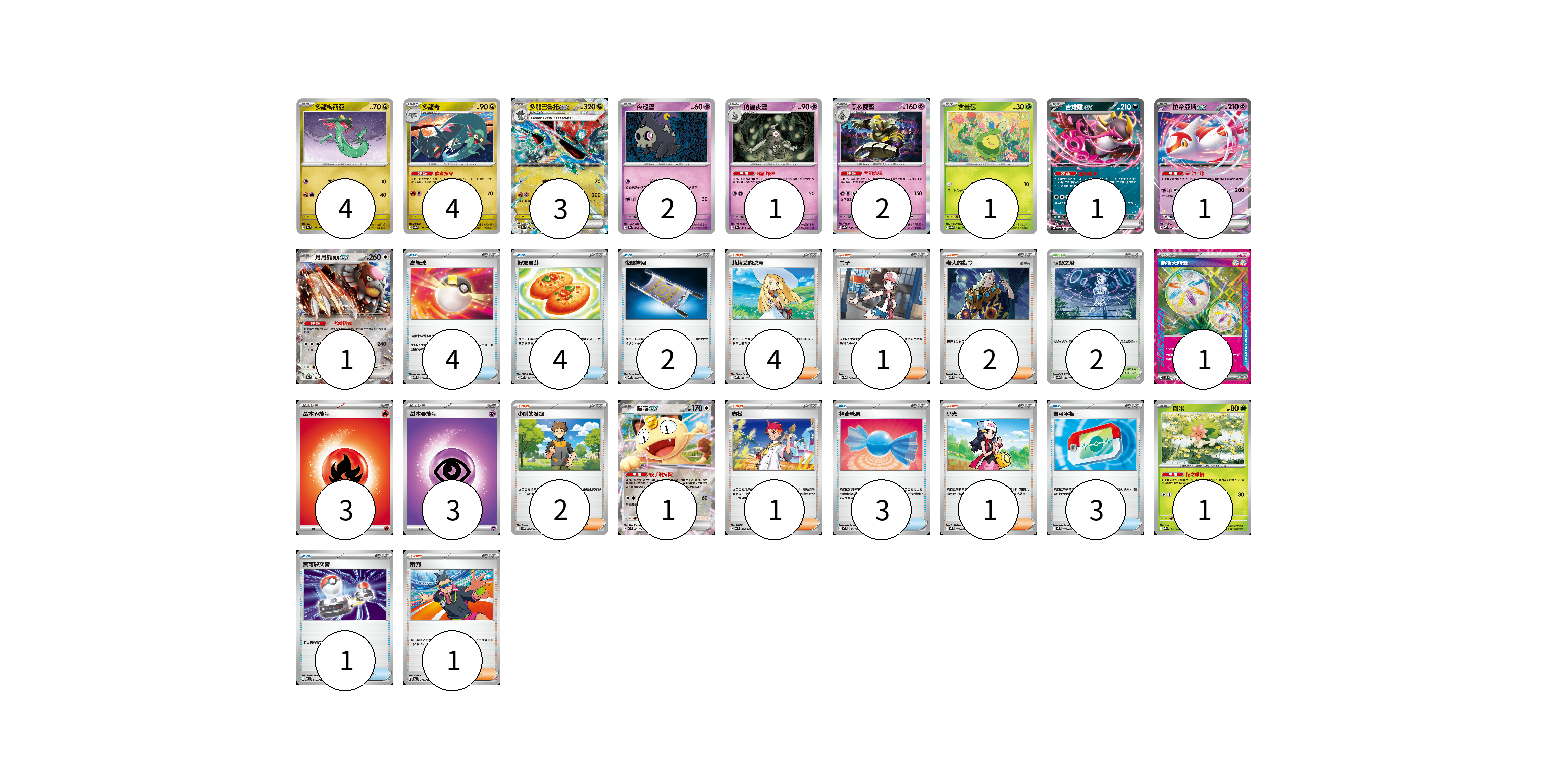 牌組構築方案 以此牌組為基礎新構築牌組 顯示卡面 顯示列表 寶可夢卡(22) 4 4 3 2 1 2 1 1 1 1 1 1 物品卡(17) 4 4 2 3 3 1 支援者卡(12) 4 1 2 2 1 1 1 競技場卡(2) 2 能量卡(7) 1 3 3 寶可夢卡(22) 卡牌名稱 張數 卡牌名稱 張數 多龍梅西亞 SV8a 118/187 04 多龍奇 SV8a 119/187 04 多龍巴魯托ex SV8a 120/187 03 夜巡靈 SV8a 064/187 02 彷徨夜靈 SV8a 065/187 01 黑夜魔靈 SV8a 066/187 02 含羞苞 SV8a 001/187 01 吉雉雞ex SVOD 004/020 01 拉帝亞斯ex MBD 003/022 01 月月熊 赫月ex SV8a 134/187 01 喵喵ex M3 061/080 01 謝米 M2a 012/193 01 物品卡(17) 卡牌名稱 張數 卡牌名稱 張數 高級球 MBD 014/022 04 好友寶芬 MBD 013/022 04 夜間擔架 MBD 016/022 02 神奇糖果 MC 655/742 03 寶可平板 M3 070/080 03 寶可夢交替 MC 663/742 01 支援者卡(12) 卡牌名稱 張數 卡牌名稱 張數 莉莉艾的決意 MBD 021/022 04 鬥子 SV11W 085/086 01 老大的指令 MBD 020/022 02 小剛的發掘 SV9 096/100 02 赤松 MC 696/742 01 小光 M2 077/080 01 裁判 MC 711/742 01 競技場卡(2) 卡牌名稱 張數 卡牌名稱 張數 阻礙之塔 SV8a 181/187 02 能量卡(7) 卡牌名稱 張數 卡牌名稱 張數 新衝天能量 SV5K 071/071 01 基本【火】能量 M-P FIR 03 基本【超】能量 MBD PSY 03 以此牌組為基礎新構築牌組 牌組編碼 zhDlJp-NxDWrH-PVFlJa copy 列印牌組單 牌組編碼已複製 分享至SNS