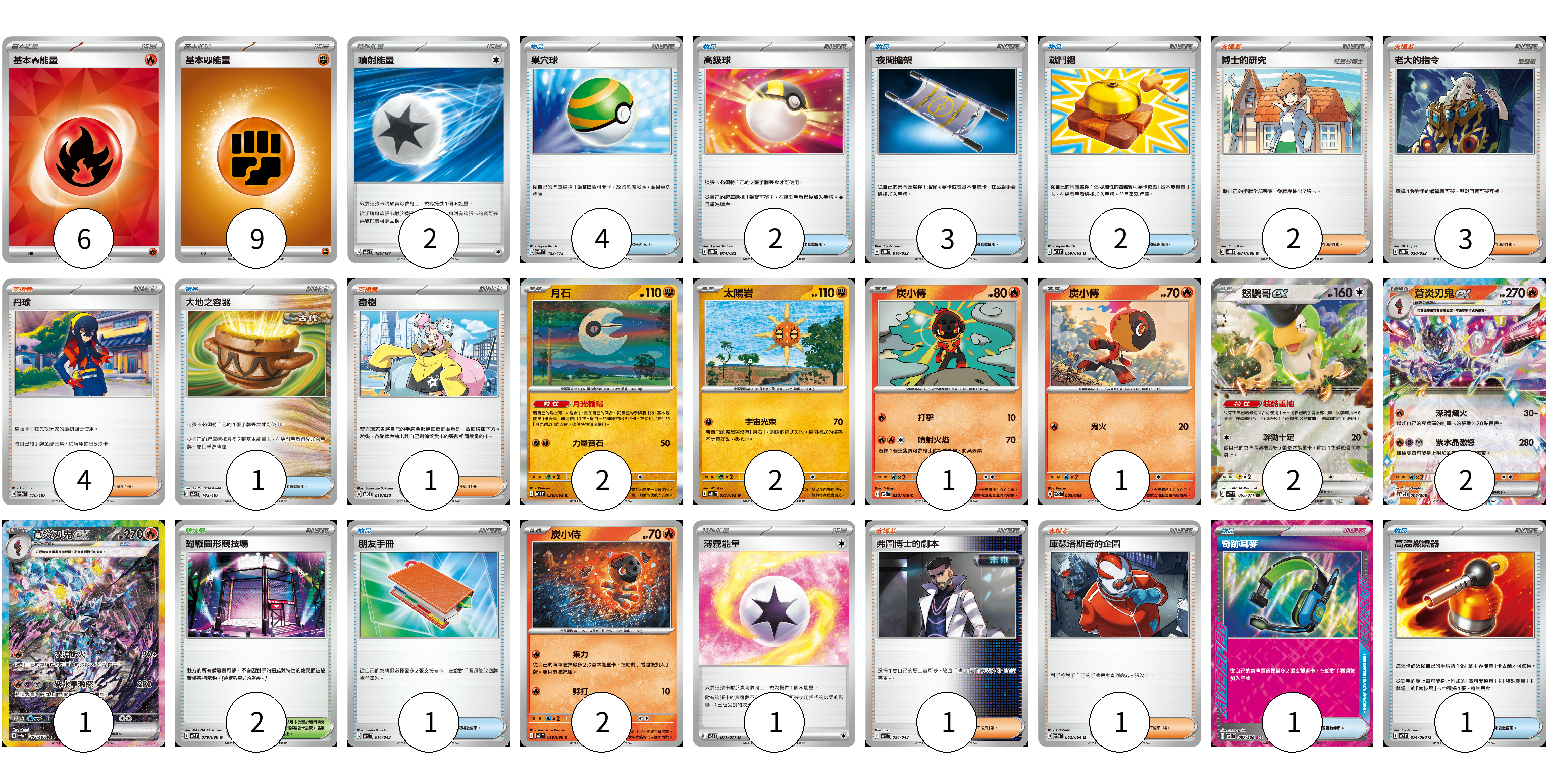 牌組構築方案 以此牌組為基礎新構築牌組 顯示卡面 顯示列表 寶可夢卡(13) 2 2 1 1 2 2 1 2 物品卡(15) 4 2 3 2 1 1 1 1 支援者卡(12) 2 3 4 1 1 1 競技場卡(2) 2 能量卡(18) 6 9 2 1 寶可夢卡(13) 卡牌名稱 張數 卡牌名稱 張數 月石 M1L 026/063 02 太陽岩 M1L 027/063 02 炭小侍 SV8 020/106 01 炭小侍 SVPS 005/008 01 怒鸚哥ex SV2P 065/071 02 蒼炎刃鬼ex SVPS 006/008 02 蒼炎刃鬼ex SV8a 203/187 01 炭小侍 M2 019/080 02 物品卡(15) 卡牌名稱 張數 卡牌名稱 張數 巢穴球 SVM 133/175 04 高級球 MBD 014/022 02 夜間擔架 MBD 016/022 03 戰鬥鑼 M1L 059/063 02 大地之容器 SV8a 143/187 01 朋友手冊 SVK 014/042 01 奇跡耳麥 SV8 097/106 01 高溫燃燒器 M2 074/080 01 支援者卡(12) 卡牌名稱 張數 卡牌名稱 張數 博士的研究 SV11B 084/086 02 老大的指令 MBD 020/022 03 丹瑜 SV8a 170/187 04 奇樹 SVOD 016/020 01 弗圖博士的劇本 SVK 034/042 01 庫瑟洛斯奇的企圖 SV6a 062/064 01 競技場卡(2) 卡牌名稱 張數 卡牌名稱 張數 對戰圓形競技場 M2 079/080 02 能量卡(18) 卡牌名稱 張數 卡牌名稱 張數 基本【火】能量 SVQL FIR 06 基本【鬥】能量 M-P FIG 09 噴射能量 SV8a 185/187 02 薄霧能量 SV5M 071/071 01 以此牌組為基礎新構築牌組 牌組編碼 zibgkH-wHzfEK-nxmIRw copy 列印牌組單 牌組編碼已複製 分享至SNS