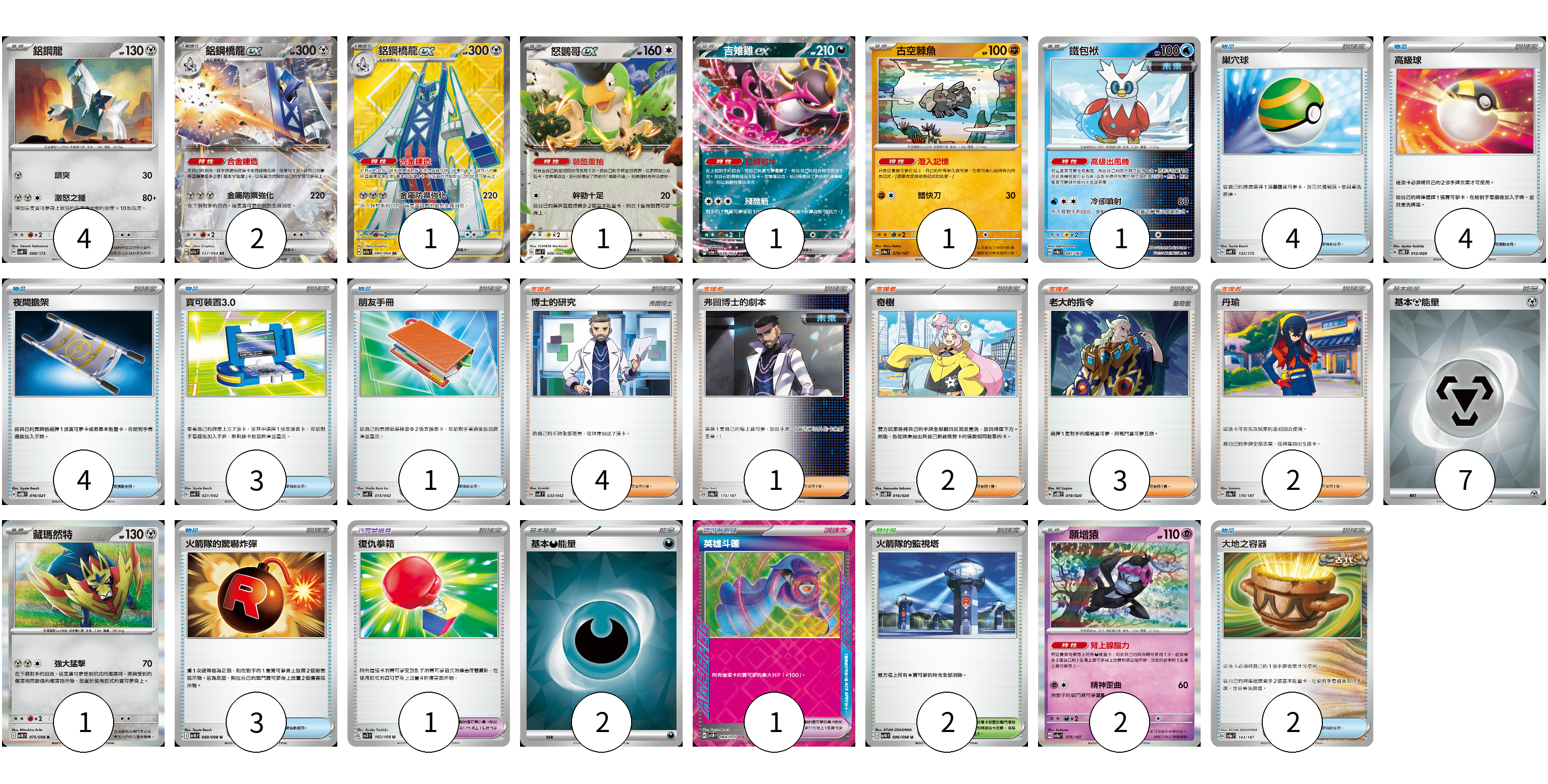 牌組構築方案 以此牌組為基礎新構築牌組 顯示卡面 顯示列表 寶可夢卡(14) 4 2 1 1 1 1 1 1 2 寶可夢道具(2) 1 1 物品卡(21) 4 4 4 3 1 3 2 支援者卡(12) 4 1 2 3 2 競技場卡(2) 2 能量卡(9) 7 2 寶可夢卡(14) 卡牌名稱 張數 卡牌名稱 張數 鋁鋼龍 SVM 088/175 04 鋁鋼橋龍ex SV7a 037/064 02 鋁鋼橋龍ex SV7a 080/064 01 怒鸚哥ex SVK 006/042 01 吉雉雞ex SV6a 038/064 01 古空棘魚 SV8a 079/187 01 鐵包袱 SV8a 047/187 01 藏瑪然特 SV10 075/098 01 願增猿 SV8a 075/187 02 寶可夢道具(2) 卡牌名稱 張數 卡牌名稱 張數 復仇拳箱 SV3 102/108 01 英雄斗篷 SV5M 064/071 01 物品卡(21) 卡牌名稱 張數 卡牌名稱 張數 巢穴球 SVM 133/175 04 高級球 SVOD 012/020 04 夜間擔架 SVOM 016/021 04 寶可裝置3.0 SVK 021/042 03 朋友手冊 SVK 014/042 01 火箭隊的驚嚇炸彈 SV10 089/098 03 大地之容器 SV8a 143/187 02 支援者卡(12) 卡牌名稱 張數 卡牌名稱 張數 博士的研究 SVK 033/042 04 弗圖博士的劇本 SV8a 175/187 01 奇樹 SVOD 016/020 02 老大的指令 SVOD 019/020 03 丹瑜 SV8a 170/187 02 競技場卡(2) 卡牌名稱 張數 卡牌名稱 張數 火箭隊的監視塔 SV10 096/098 02 能量卡(9) 卡牌名稱 張數 卡牌名稱 張數 基本【鋼】能量 SVOD MET 07 基本【惡】能量 SVOM DAR 02 以此牌組為基礎新構築牌組 牌組編碼 zjYAiz-LGjZdF-kbbnVn copy 列印牌組單 牌組編碼已複製 分享至SNS