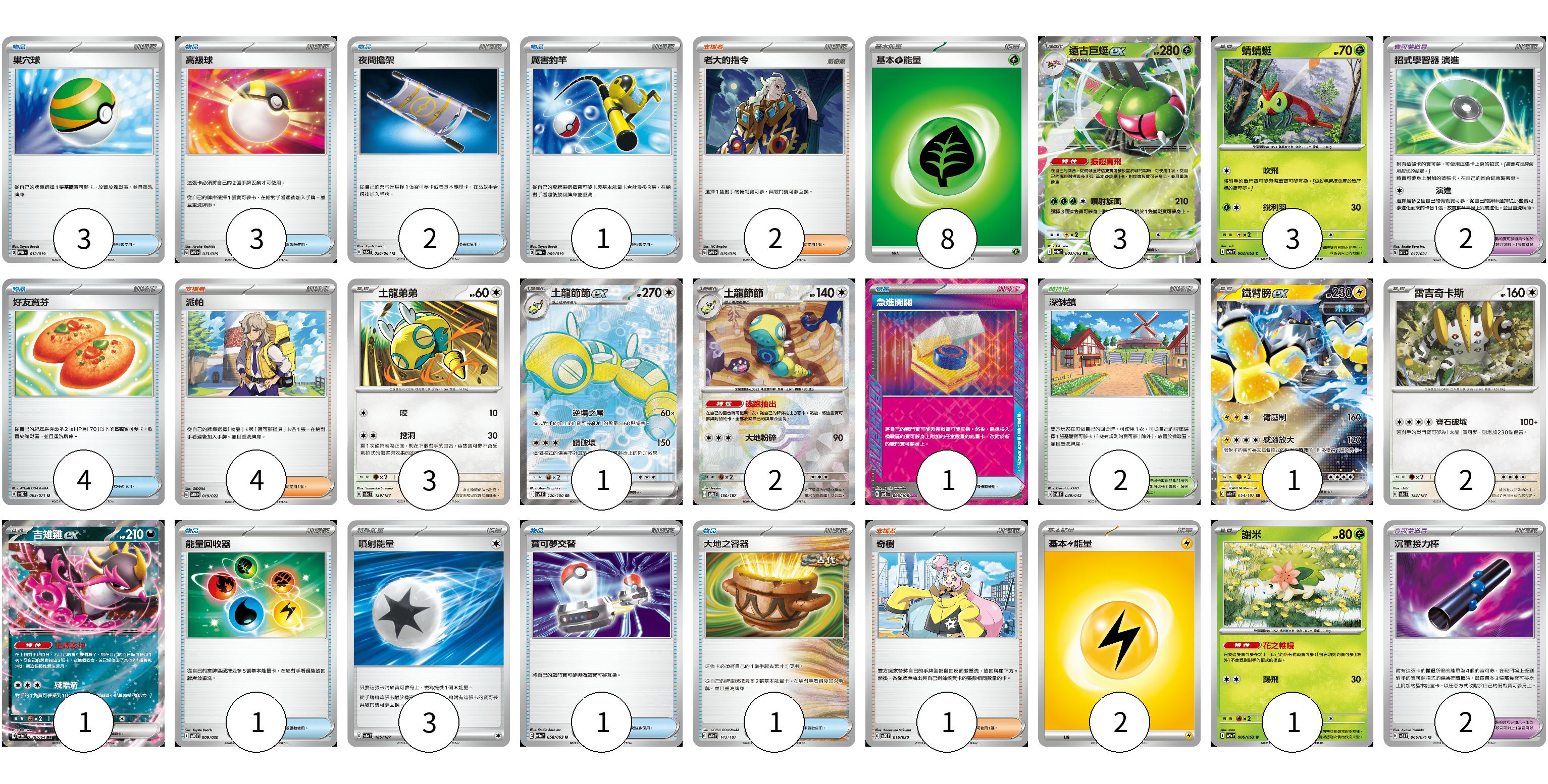 牌組構築方案 以此牌組為基礎新構築牌組 顯示卡面 顯示列表 寶可夢卡(17) 3 3 3 1 2 1 2 1 1 寶可夢道具(4) 2 2 物品卡(17) 3 3 2 1 4 1 1 1 1 支援者卡(7) 2 4 1 競技場卡(2) 2 能量卡(13) 8 3 2 寶可夢卡(17) 卡牌名稱 張數 卡牌名稱 張數 遠古巨蜓ex SV9a 003/063 03 蜻蜻蜓 SV9a 002/063 03 土龍弟弟 SV8a 129/187 03 土龍節節ex SV9 120/100 01 土龍節節 SV8a 130/187 02 鐵臂膀ex SV8a 054/187 01 雷吉奇卡斯 SV8a 132/187 02 吉雉雞ex SV6a 038/064 01 謝米 SV9a 006/063 01 寶可夢道具(4) 卡牌名稱 張數 卡牌名稱 張數 招式學習器 演進 SVTL 017/021 02 沉重接力棒 SV5M 066/071 02 物品卡(17) 卡牌名稱 張數 卡牌名稱 張數 巢穴球 SVTG 012/019 03 高級球 SVTG 013/019 03 夜間擔架 SV6a 056/064 02 厲害釣竿 SVTG 009/019 01 好友寶芬 SV5K 063/071 04 急進開關 SV8 095/106 01 能量回收器 SVOD 009/020 01 寶可夢交替 SV9a 058/063 01 大地之容器 SV8a 143/187 01 支援者卡(7) 卡牌名稱 張數 卡牌名稱 張數 老大的指令 SVTG 019/019 02 派帕 SVTM 019/022 04 奇樹 SVOD 016/020 01 競技場卡(2) 卡牌名稱 張數 卡牌名稱 張數 深缽鎮 SVK 039/042 02 能量卡(13) 卡牌名稱 張數 卡牌名稱 張數 基本【草】能量 SVTM GRA 08 噴射能量 SV8a 185/187 03 基本【雷】能量 SVD LIG 02 以此牌組為基礎新構築牌組 牌組編碼 zmTNHX-ByrmDm-kMykfP copy 列印牌組單 牌組編碼已複製 分享至SNS