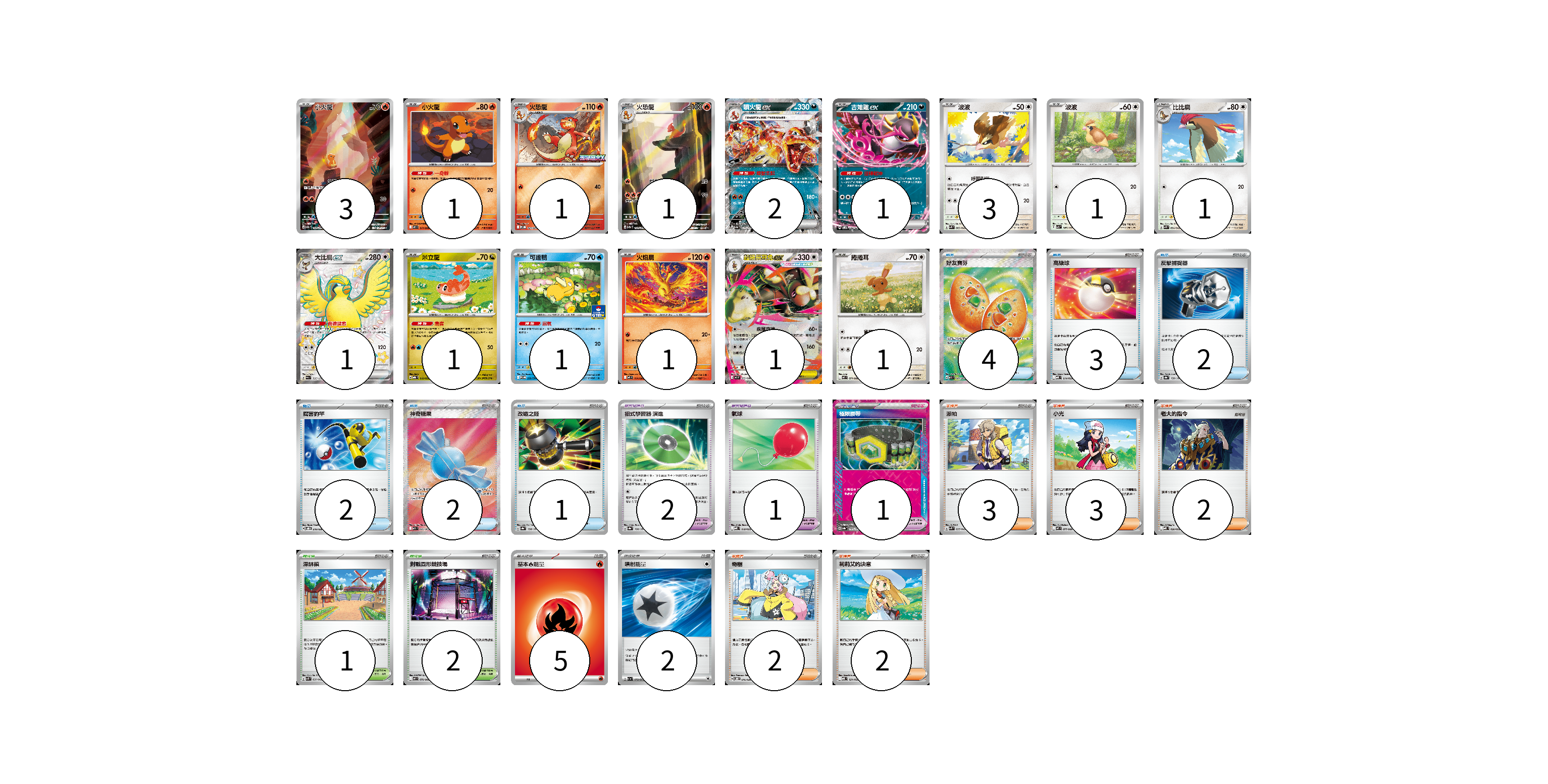 牌組構築方案 以此牌組為基礎新構築牌組 顯示卡面 顯示列表 寶可夢卡(20) 3 1 1 1 2 1 3 1 1 1 1 1 1 1 1 寶可夢道具(3) 2 1 物品卡(15) 4 3 2 2 2 1 1 支援者卡(12) 3 3 2 2 2 競技場卡(3) 1 2 能量卡(7) 5 2 寶可夢卡(20) 卡牌名稱 張數 卡牌名稱 張數 小火龍 SV2a 168/165 03 小火龍 M2 011/080 01 火恐龍 M-P 021/M-P 01 火恐龍 SV2a 169/165 01 噴火龍ex SV4a 115/190 02 吉雉雞ex SVOM 009/021 01 波波 SVK 003/042 03 波波 SV3 087/108 01 比比鳥 SVK 004/042 01 大比鳥ex SV4a 335/190 01 米立龍 MBG 010/022 01 可達鴨 SV-P 220/SV-P 01 火焰鳥 M2 014/080 01 超級長耳兔ex M2 072/080 01 捲捲耳 M2 071/080 01 寶可夢道具(3) 卡牌名稱 張數 卡牌名稱 張數 招式學習器 演進 SV8a 160/187 02 極限腰帶 SV8a 159/187 01 物品卡(15) 卡牌名稱 張數 卡牌名稱 張數 好友寶芬 M1S 081/063 04 高級球 MBD 014/022 03 反擊捕捉器 SV8a 139/187 02 厲害釣竿 SVOD 010/020 02 神奇糖果 M1S 082/063 02 改造之錘 SV8a 138/187 01 氣球 MBD 018/022 01 支援者卡(12) 卡牌名稱 張數 卡牌名稱 張數 派帕 SVK 035/042 03 小光 M2 077/080 03 老大的指令 MBD 020/022 02 奇樹 SVOD 016/020 02 莉莉艾的決意 MBD 021/022 02 競技場卡(3) 卡牌名稱 張數 卡牌名稱 張數 深缽鎮 SVK 039/042 01 對戰圓形競技場 M2 079/080 02 能量卡(7) 卡牌名稱 張數 卡牌名稱 張數 基本火能量 sv-p FIR 05 噴射能量 SV1a 072/073 02 以此牌組為基礎新構築牌組 牌組編碼 zpkhmo-GFZNxj-edTCxw copy 列印牌組單 牌組編碼已複製 分享至SNS