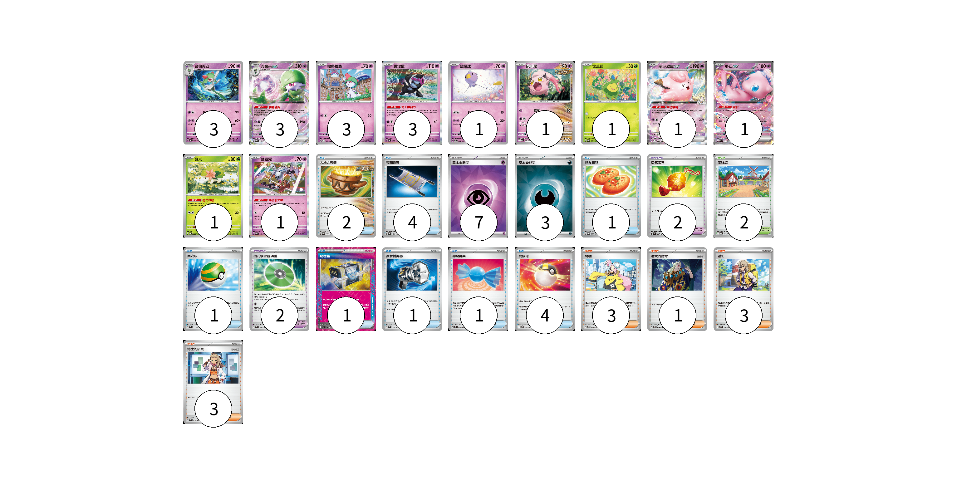牌組構築方案 以此牌組為基礎新構築牌組 顯示卡面 顯示列表 寶可夢卡(19) 3 3 3 3 1 1 1 1 1 1 1 寶可夢道具(4) 2 2 物品卡(15) 2 4 1 1 1 1 1 4 支援者卡(10) 3 1 3 3 競技場卡(2) 2 能量卡(10) 7 3 寶可夢卡(19) 卡牌名稱 張數 卡牌名稱 張數 奇魯莉安 SV4a 081/190 03 沙奈朵ex SV4a 082/190 03 拉魯拉絲 SVTS 002/022 03 願增猿 SV8a 075/187 03 飄飄球 SVTS 005/022 01 吼叫尾 SV4K 032/066 01 含羞苞 SV8a 001/187 01 莉莉艾的皮皮ex SV9 033/100 01 夢幻ex SVK 001/042 01 謝米 SV9a 006/063 01 鑰圈兒 SV4a 087/190 01 寶可夢道具(4) 卡牌名稱 張數 卡牌名稱 張數 勇氣護符 SV2D 067/071 02 招式學習器 演進 SV8a 160/187 02 物品卡(15) 卡牌名稱 張數 卡牌名稱 張數 大地之容器 SV8a 143/187 02 夜間擔架 SV8a 151/187 04 好友寶芬 SV5K 063/071 01 巢穴球 SVM 133/175 01 秘密箱 SV6 092/101 01 反擊捕捉器 SV8a 139/187 01 神奇糖果 SVOD 013/020 01 高級球 SVOD 012/020 04 支援者卡(10) 卡牌名稱 張數 卡牌名稱 張數 奇樹 SVOD 016/020 03 老大的指令 SVOD 019/020 01 派帕 SVOD 018/020 03 博士的研究 SVK 032/042 03 競技場卡(2) 卡牌名稱 張數 卡牌名稱 張數 深缽鎮 SV4a 185/190 02 能量卡(10) 卡牌名稱 張數 卡牌名稱 張數 基本【超】能量 SVK PSY 07 基本【惡】能量 SVK DAR 03 以此牌組為基礎新構築牌組 牌組編碼 zsOZNr-vWfWmH-qdmMpR copy 列印牌組單 牌組編碼已複製 分享至SNS