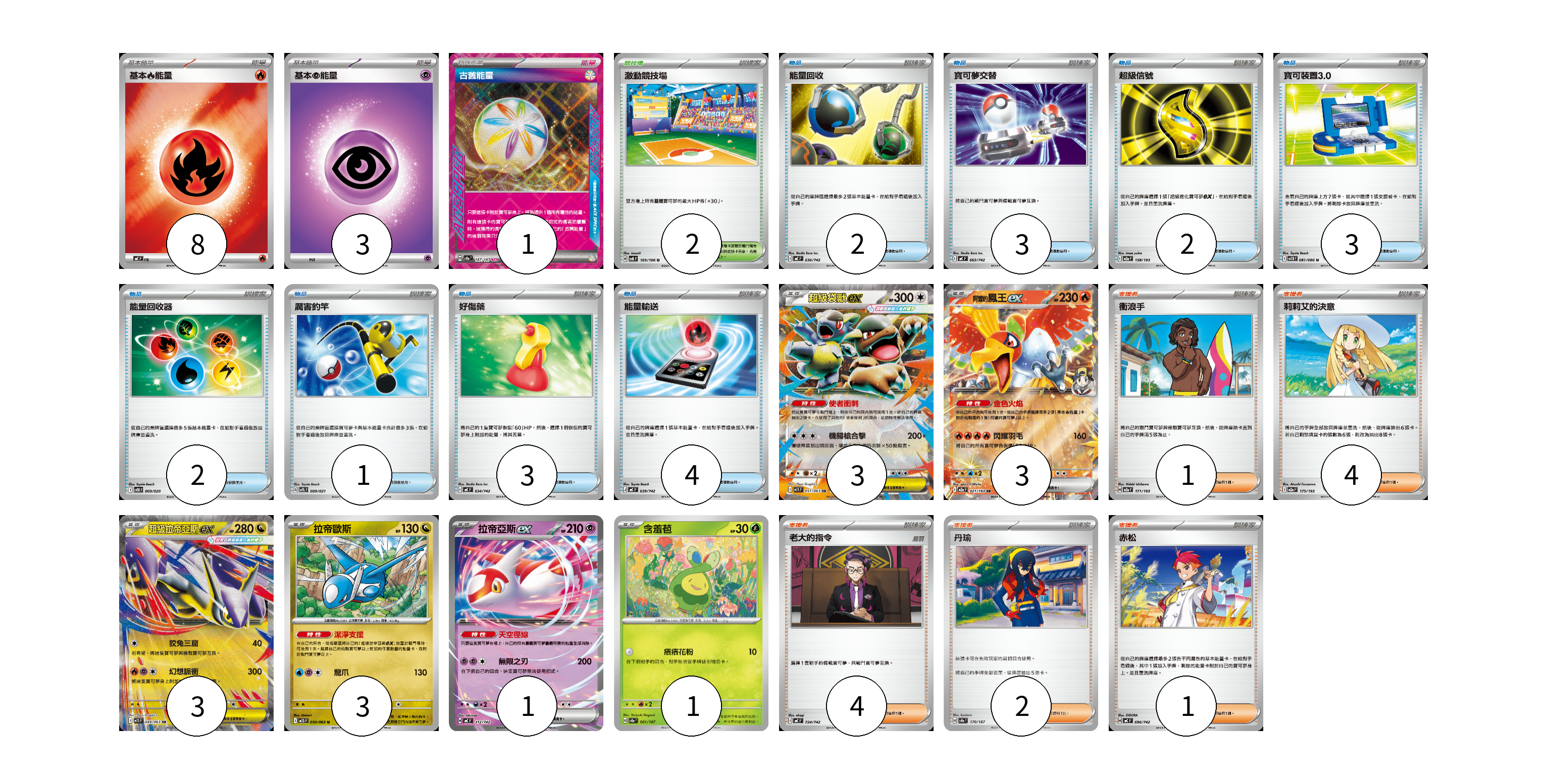 牌組構築方案 以此牌組為基礎新構築牌組 顯示卡面 顯示列表 寶可夢卡(14) 3 3 3 3 1 1 物品卡(20) 2 3 2 3 2 1 3 4 支援者卡(12) 1 4 4 2 1 競技場卡(2) 2 能量卡(12) 8 3 1 寶可夢卡(14) 卡牌名稱 張數 卡牌名稱 張數 超級袋獸ex M1S 051/063 03 <阿響的>鳳王ex M2a 021/193 03 超級拉帝亞斯ex M1S 049/063 03 拉帝歐斯 M1S 050/063 03 拉帝亞斯ex MC 312/742 01 含羞苞 SV8a 001/187 01 物品卡(20) 卡牌名稱 張數 卡牌名稱 張數 能量回收 MC 636/742 02 寶可夢交替 MC 663/742 03 超級信號 M2a 158/193 02 寶可裝置3.0 SV11B 081/086 03 能量回收器 SVOD 009/020 02 厲害釣竿 SVTL 009/021 01 好傷藥 MC 634/742 03 能量輸送 MC 639/742 04 支援者卡(12) 卡牌名稱 張數 卡牌名稱 張數 衝浪手 M2a 171/193 01 莉莉艾的決意 M2a 175/193 04 老大的指令 MC 724/742 04 丹瑜 SV8a 170/187 02 赤松 MC 696/742 01 競技場卡(2) 卡牌名稱 張數 卡牌名稱 張數 激動競技場 SV8 105/106 02 能量卡(12) 卡牌名稱 張數 卡牌名稱 張數 基本【火】能量 MC FIR 08 基本【超】能量 MC PSY 03 古舊能量 SV8a 187/187 01 以此牌組為基礎新構築牌組 牌組編碼 ztaKYv-WRbMIt-jPNdsb copy 列印牌組單 牌組編碼已複製 分享至SNS