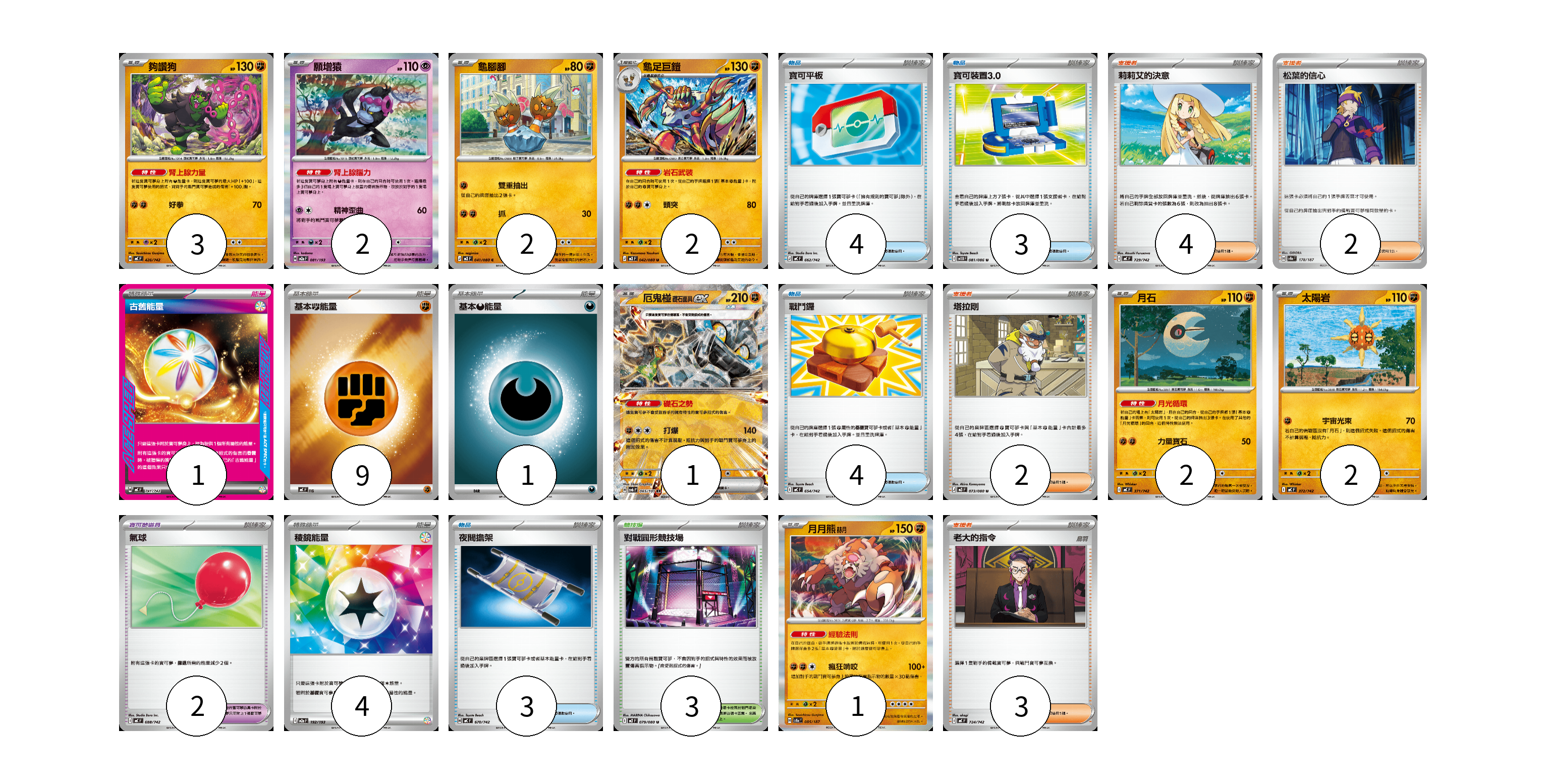 牌組構築方案 以此牌組為基礎新構築牌組 顯示卡面 顯示列表 寶可夢卡(15) 3 2 2 2 1 2 2 1 寶可夢道具(2) 2 物品卡(14) 4 3 4 3 支援者卡(11) 4 2 2 3 競技場卡(3) 3 能量卡(15) 1 9 1 4 寶可夢卡(15) 卡牌名稱 張數 卡牌名稱 張數 夠讚狗 MC 426/742 03 願增猿 M2a 081/193 02 龜腳腳 M3 041/080 02 龜足巨鎧 M3 042/080 02 厄鬼椪 礎石面具ex SV6 065/101 01 月石 MC 371/742 02 太陽岩 MC 372/742 02 月月熊 赫月 SV8a 085/187 01 寶可夢道具(2) 卡牌名稱 張數 卡牌名稱 張數 氣球 MC 688/742 02 物品卡(14) 卡牌名稱 張數 卡牌名稱 張數 寶可平板 MC 662/742 04 寶可裝置3.0 SV11B 081/086 03 戰鬥鑼 MC 654/742 04 夜間擔架 MC 670/742 03 支援者卡(11) 卡牌名稱 張數 卡牌名稱 張數 莉莉艾的決意 MC 729/742 04 松葉的信心 SV8a 178/187 02 塔拉剛 M3 073/080 02 老大的指令 MC 724/742 03 競技場卡(3) 卡牌名稱 張數 卡牌名稱 張數 對戰圓形競技場 M2 079/080 03 能量卡(15) 卡牌名稱 張數 卡牌名稱 張數 古舊能量 MC 741/742 01 基本【鬥】能量 MC FIG 09 基本【惡】能量 MC DAR 01 稜鏡能量 M2a 192/193 04 以此牌組為基礎新構築牌組 牌組編碼 zuMKOu-JBHDbs-husamo copy 列印牌組單 牌組編碼已複製 分享至SNS
