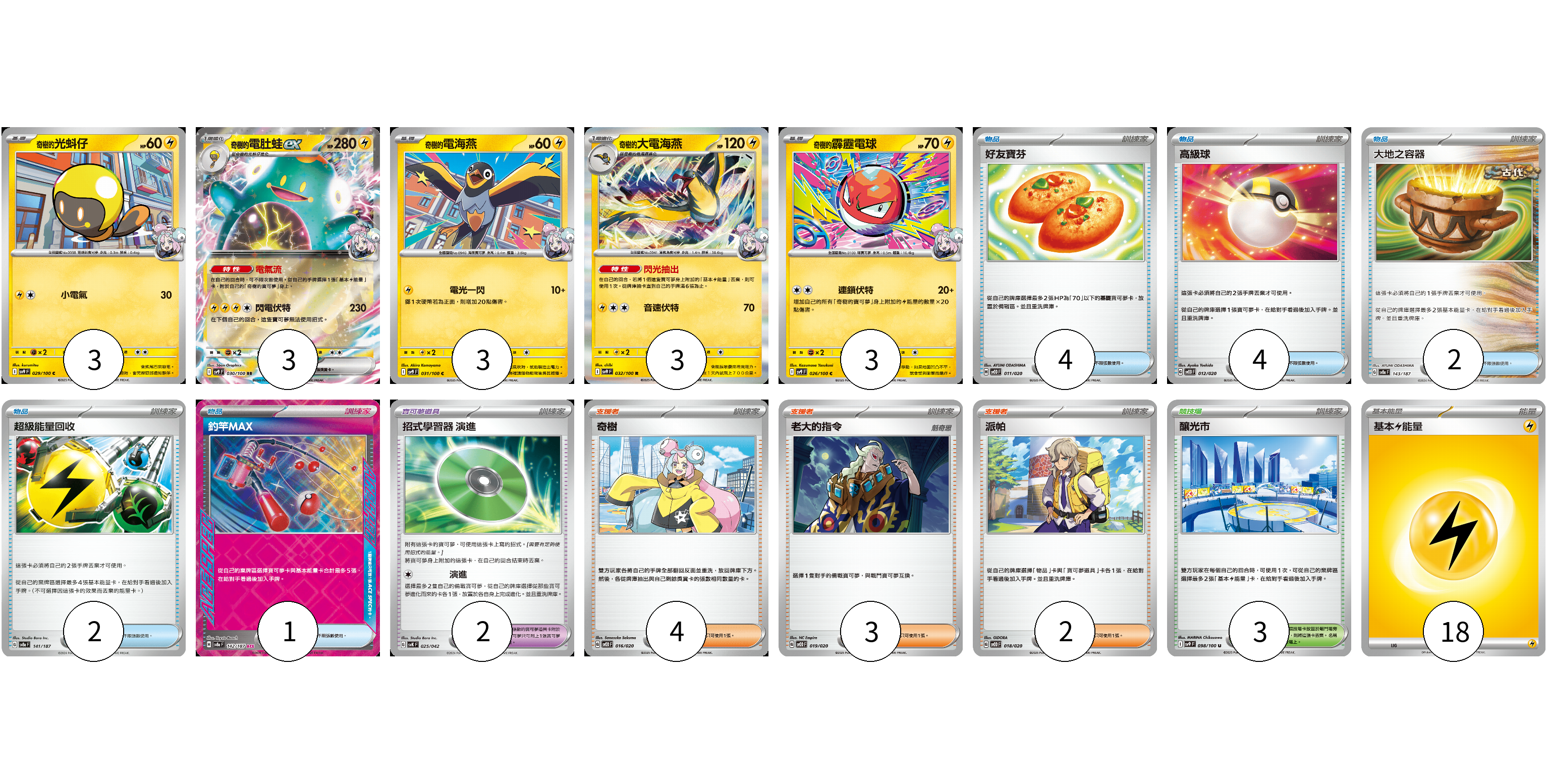 牌組構築方案 以此牌組為基礎新構築牌組 顯示卡面 顯示列表 寶可夢卡(15) 3 3 3 3 3 寶可夢道具(2) 2 物品卡(13) 4 4 2 2 1 支援者卡(9) 4 3 2 競技場卡(3) 3 能量卡(18) 18 寶可夢卡(15) 卡牌名稱 張數 卡牌名稱 張數 奇樹的光蚪仔 SV9 029/100 03 奇樹的電肚蛙ex SV9 030/100 03 奇樹的電海燕 SV9 031/100 03 奇樹的大電海燕 SV9 032/100 03 奇樹的霹靂電球 SV9 026/100 03 寶可夢道具(2) 卡牌名稱 張數 卡牌名稱 張數 招式學習器 演進 SVK 025/042 02 物品卡(13) 卡牌名稱 張數 卡牌名稱 張數 好友寶芬 SVOD 011/020 04 高級球 SVOD 012/020 04 大地之容器 SV8a 143/187 02 超級能量回收 SV8a 141/187 02 釣竿MAX SV8a 142/187 01 支援者卡(9) 卡牌名稱 張數 卡牌名稱 張數 奇樹 SVOD 016/020 04 老大的指令 SVOD 019/020 03 派帕 SVOD 018/020 02 競技場卡(3) 卡牌名稱 張數 卡牌名稱 張數 釀光市 SV9 098/100 03 能量卡(18) 卡牌名稱 張數 卡牌名稱 張數 基本【雷】能量 SVTR LIG 18 以此牌組為基礎新構築牌組 牌組編碼 zvIacH-ywWaZf-WQrSeI copy 列印牌組單 牌組編碼已複製 分享至SNS