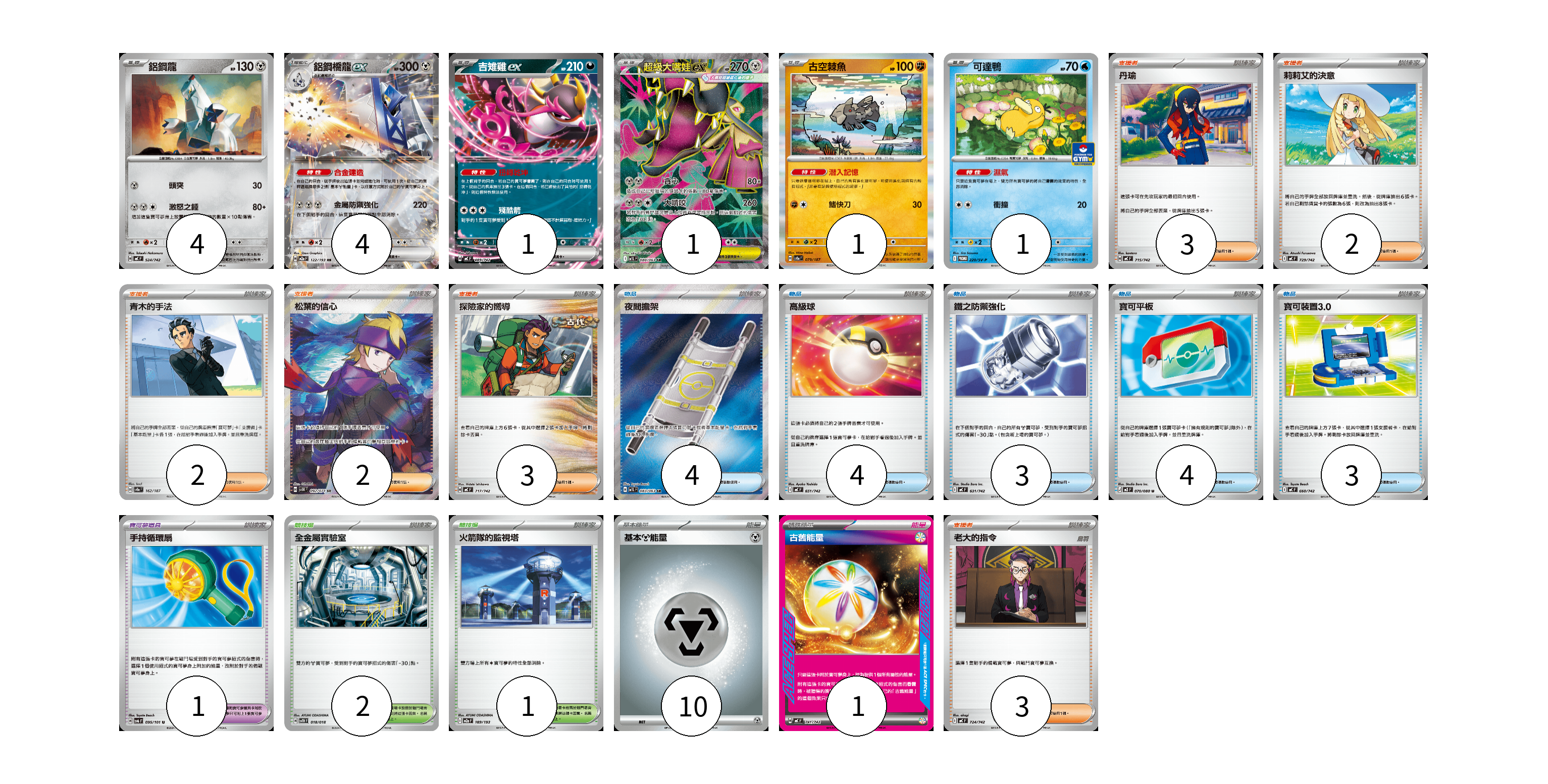 牌組構築方案 以此牌組為基礎新構築牌組 顯示卡面 顯示列表 寶可夢卡(12) 4 4 1 1 1 1 寶可夢道具(1) 1 物品卡(18) 4 4 3 4 3 支援者卡(15) 3 2 2 2 3 3 競技場卡(3) 2 1 能量卡(11) 10 1 寶可夢卡(12) 卡牌名稱 張數 卡牌名稱 張數 鋁鋼龍 MC 524/742 04 鋁鋼橋龍ex M2a 122/193 04 吉雉雞ex MC 489/742 01 超級大嘴娃ex M1L 080/063 01 古空棘魚 SV8a 079/187 01 可達鴨 SV-P 220/SV-P 01 寶可夢道具(1) 卡牌名稱 張數 卡牌名稱 張數 手持循環扇 SV6 095/101 01 物品卡(18) 卡牌名稱 張數 卡牌名稱 張數 夜間擔架 M1L 083/063 04 高級球 MC 651/742 04 鐵之防禦強化 MC 631/742 03 寶可平板 M3 070/080 04 寶可裝置3.0 MC 660/742 03 支援者卡(15) 卡牌名稱 張數 卡牌名稱 張數 丹瑜 MC 715/742 03 莉莉艾的決意 MC 729/742 02 青木的手法 SV8a 162/187 02 松葉的信心 SV5K 092/071 02 探險家的嚮導 MC 717/742 03 老大的指令 MC 724/742 03 競技場卡(3) 卡牌名稱 張數 卡牌名稱 張數 全金屬實驗室 SVTH 018/018 02 火箭隊的監視塔 M2a 189/193 01 能量卡(11) 卡牌名稱 張數 卡牌名稱 張數 基本【鋼】能量 MC MET 10 古舊能量 MC 741/742 01 以此牌組為基礎新構築牌組 牌組編碼 zzVKLY-hOmZjO-sqDHat copy 列印牌組單 牌組編碼已複製 分享至SNS