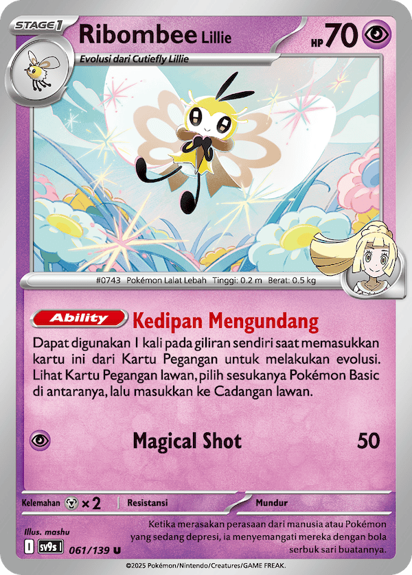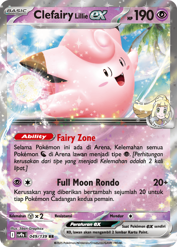Saat memasukkan kartu ini dari Kartu Pegangan untuk melakukan evolusi, Ability Kedipan Mengundang dapat digunakan untuk memilih sesukanya Pokémon Basic dari Kartu Pegangan lawan, lalu memasukkannya ke Cadangan lawan! Tambahkan Pokémon Cadangan lawan dan tingkatkan kerusakan akibat serangan Full Moon Rondo Clefairy Lillie ex!