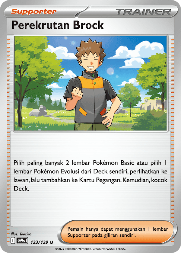 Supporter yang dapat memilih paling banyak 2 lembar Pokémon Basic atau memilih 1 lembar Pokémon Evolusi dari Deck sendiri, memperlihatkannya ke lawan, lalu menambahkannya ke Kartu Pegangan!