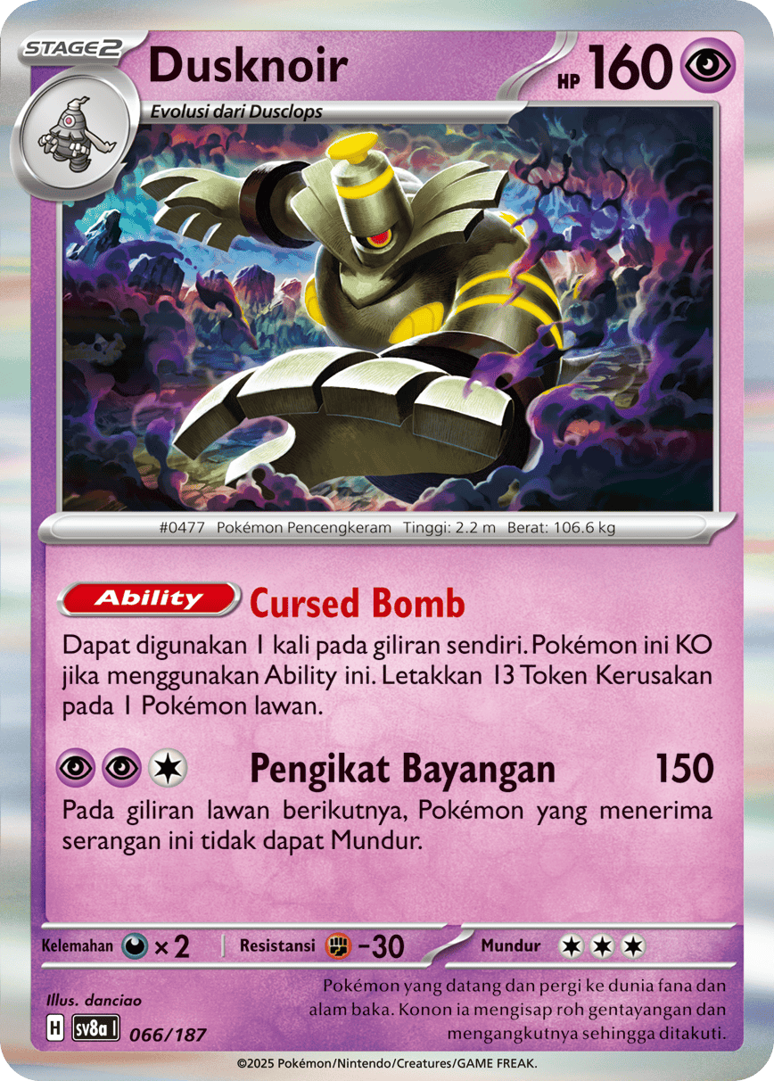 Dapat digunakan 1 kali pada giliran sendiri. Pokémon ini KO jika menggunakan Ability ini. Letakkan 13 Token Kerusakan pada 1 Pokémon lawan.