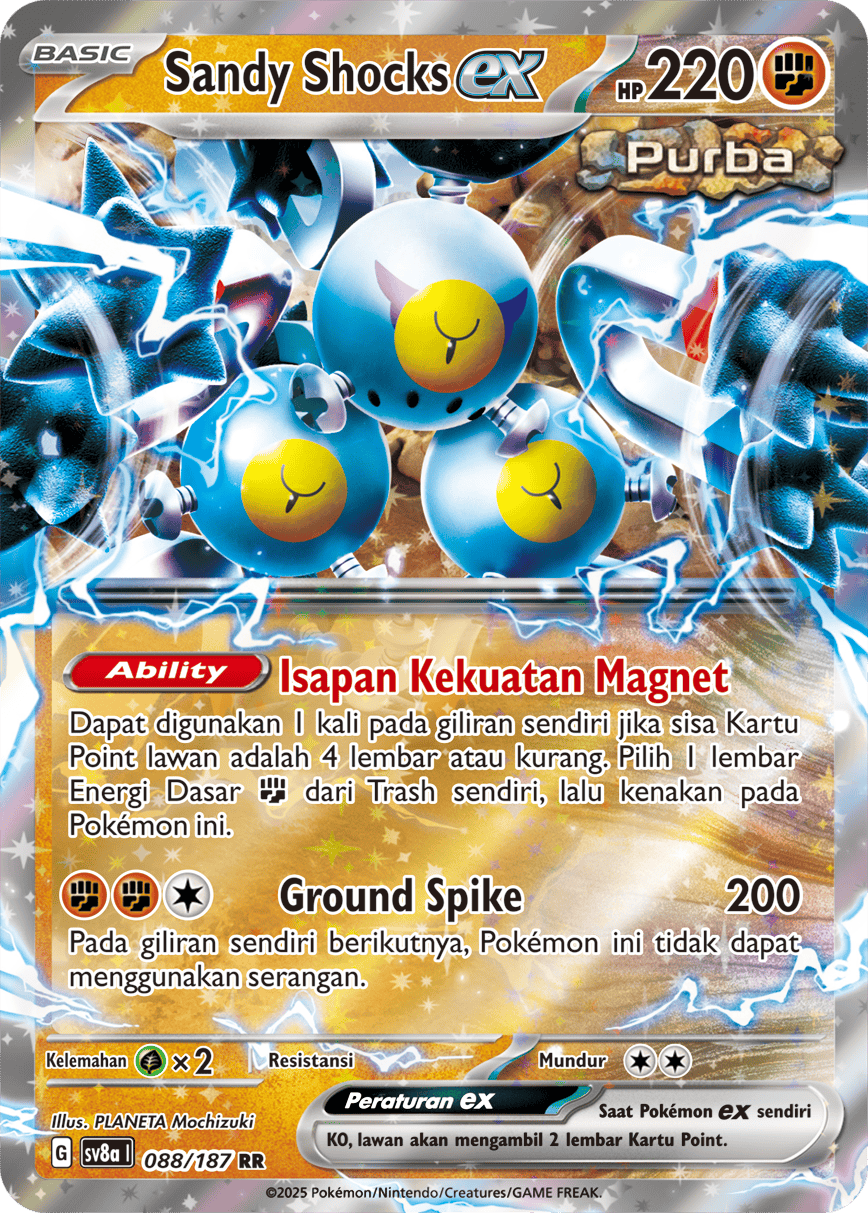 Dapat digunakan 1 kali pada giliran sendiri jika sisa Kartu Point lawan adalah 4 lembar atau kurang. Pilih 1 lembar Energi Dasar {Petarung} dari Trash sendiri, lalu kenakan pada Pokémon ini.