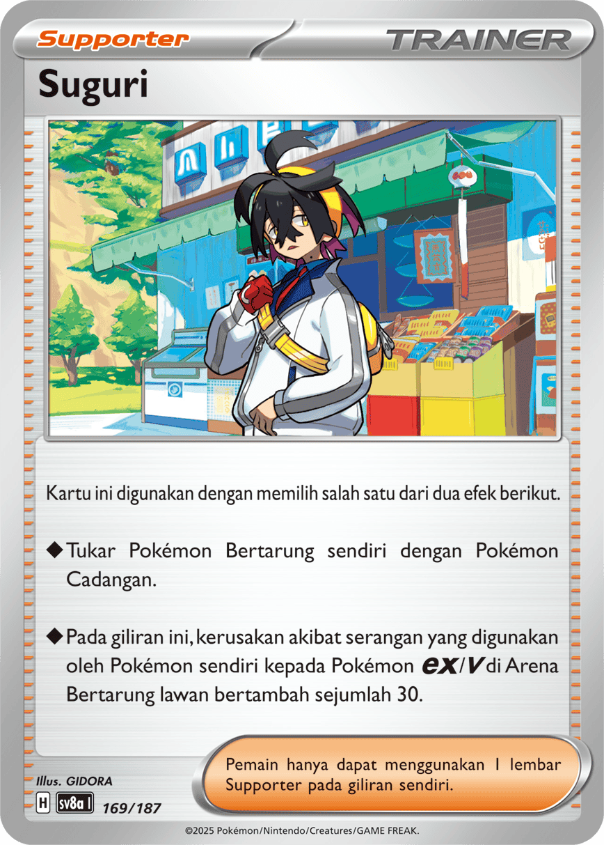 Kartu ini digunakan dengan memilih salah satu dari dua efek berikut. ◆ Tukar Pokémon Bertarung sendiri dengan Pokémon Cadangan. ◆ Pada giliran ini, kerusakan akibat serangan yang digunakan oleh Pokémon sendiri kepada Pokémon {ex}/{V} di Arena Bertarung lawan bertambah sejumlah 30.