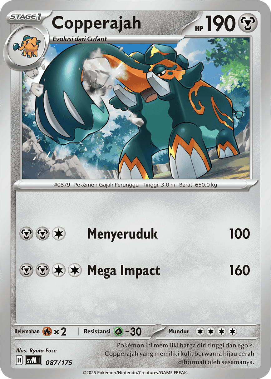Pokémon ini memiliki harga diri tinggi dan egois. Copperajah yang memiliki kulit berwarna hijau cerah dihormati oleh sesamanya.