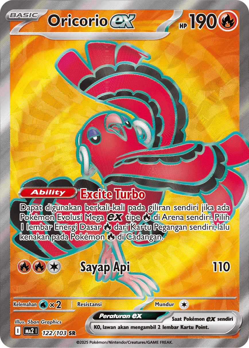 Dapat digunakan berkali-kali pada giliran sendiri jika ada Pokémon Evolusi Mega {ex} tipe {Api} di Arena sendiri. Pilih 1 lembar Energi Dasar {Api} dari Kartu Pegangan sendiri, lalu kenakan pada Pokémon {Api} di Cadangan.