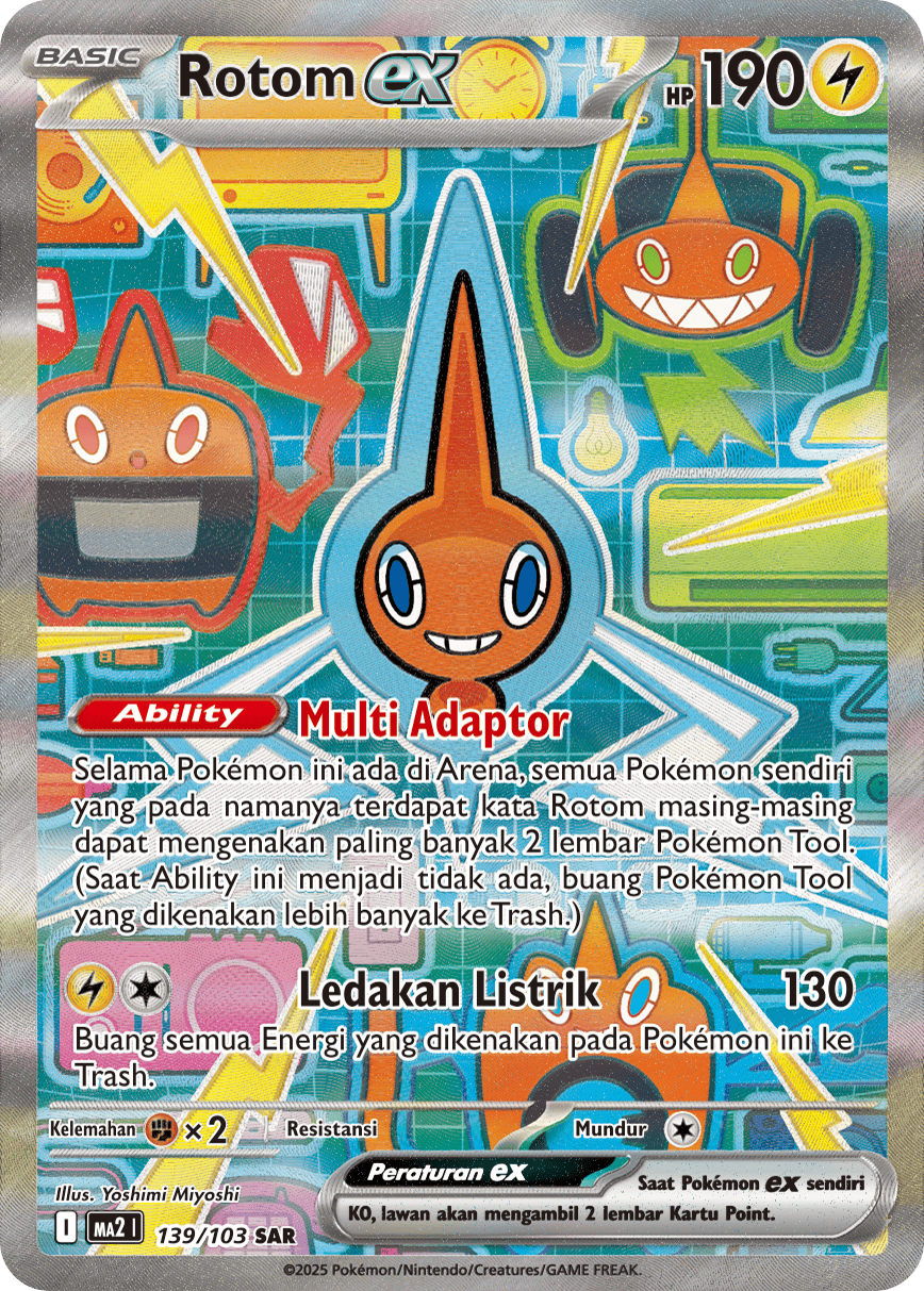 Selama Pokémon ini ada di Arena, semua Pokémon sendiri yang pada namanya terdapat kata Rotom masing-masing dapat mengenakan paling banyak 2 lembar Pokémon Tool. (Saat Ability ini menjadi tidak ada, buang Pokémon Tool yang dikenakan lebih banyak ke Trash.)