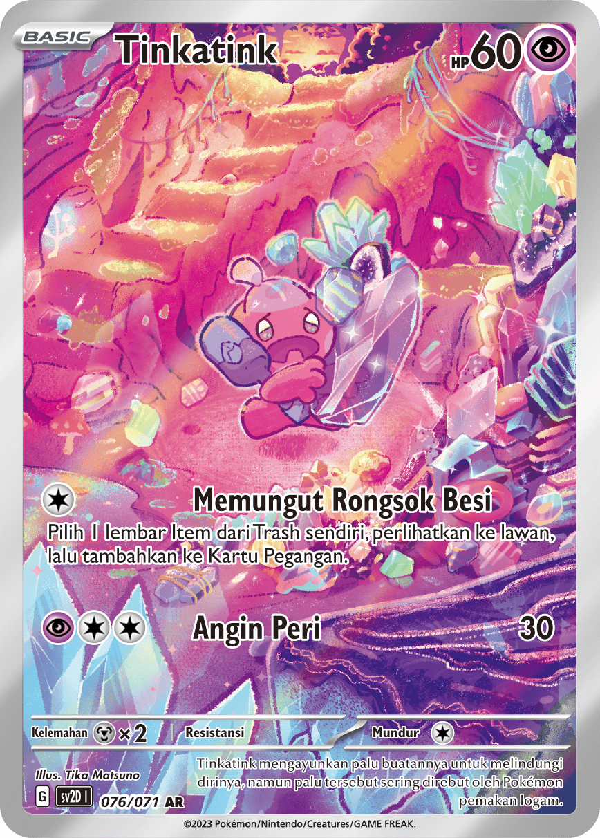 Tinkatink mengayunkan palu buatannya untuk melindungi dirinya, namun palu tersebut sering direbut oleh Pokémon pemakan logam.