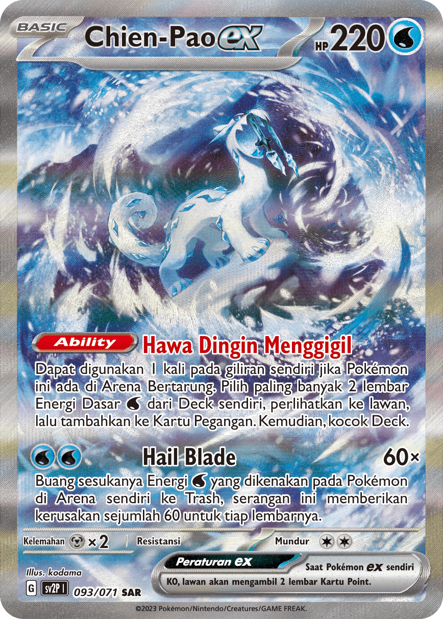 Dapat digunakan 1 kali pada giliran sendiri jika Pokémon ini ada di Arena Bertarung. Pilih paling banyak 2 lembar Energi Dasar {Air} dari Deck sendiri, perlihatkan ke lawan, lalu tambahkan ke Kartu Pegangan. Kemudian, kocok Deck.