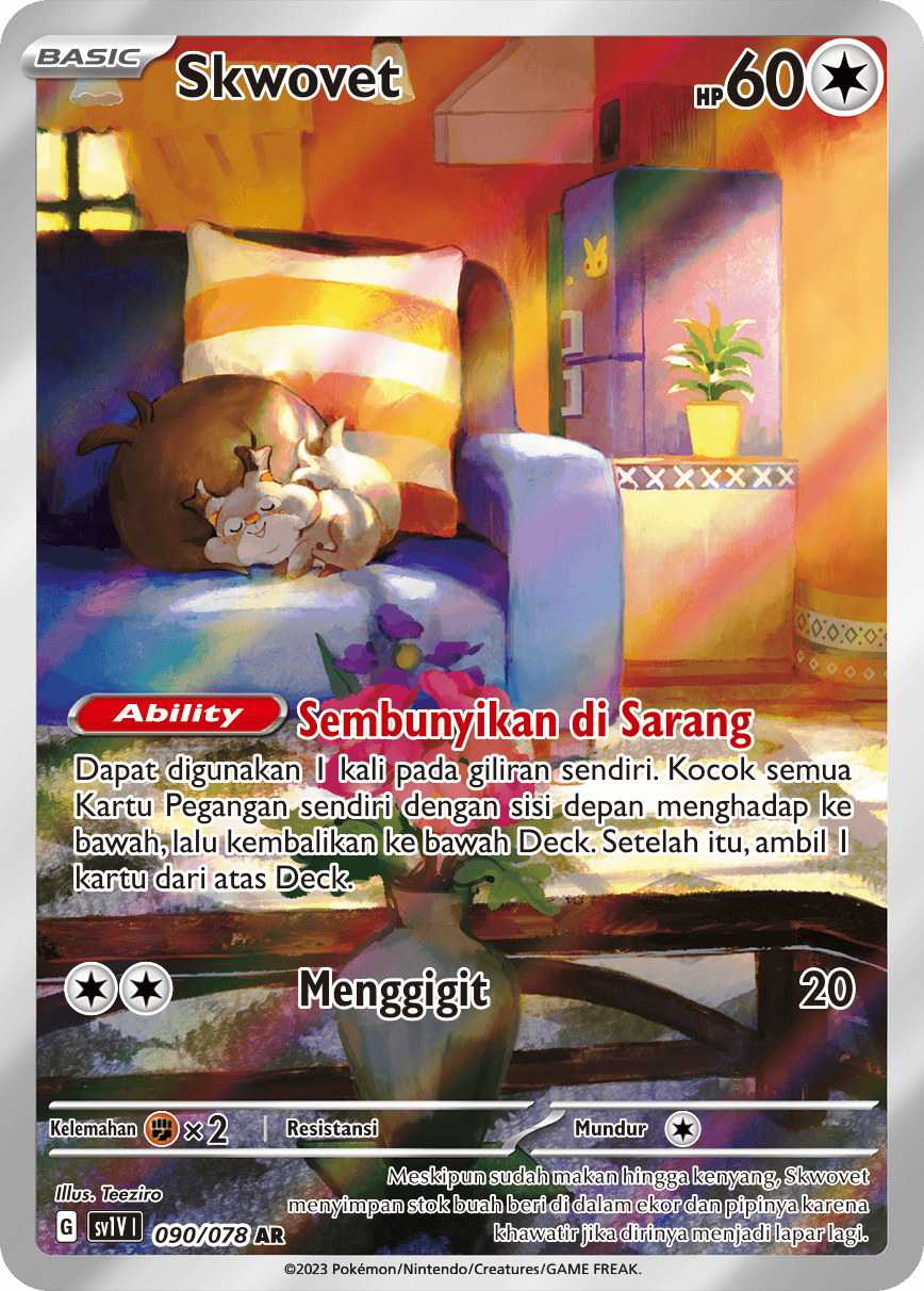 Meskipun sudah makan hingga kenyang, Skwovet menyimpan stok buah beri di dalam ekor dan pipinya karena khawatir jika dirinya menjadi lapar lagi.