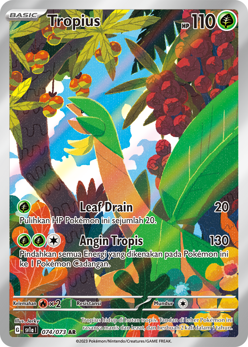 Tropius hidup di hutan tropis. Tandan di leher Pokémon ini rasanya manis dan lezat, dan berbuah 2 kali dalam 1 tahun.
