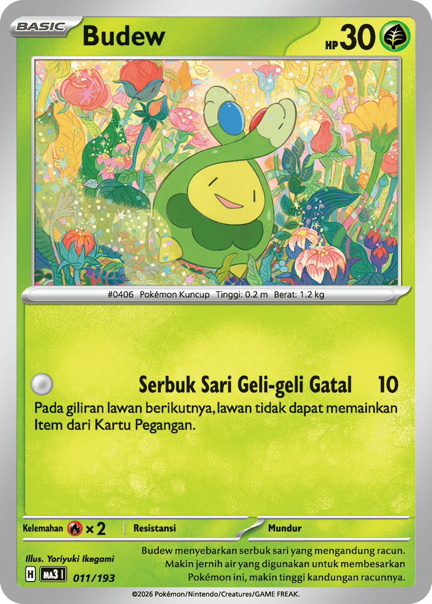 Budew menyebarkan serbuk sari yang mengandung racun. Makin jernih air yang digunakan untuk membesarkan Pokémon ini, makin tinggi kandungan racunnya.