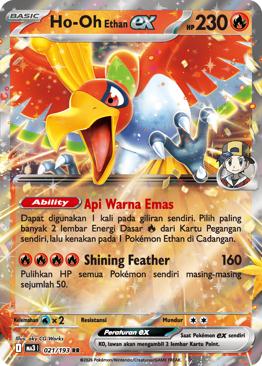 Dapat digunakan 1 kali pada giliran sendiri. Pilih paling banyak 2 lembar Energi Dasar {Api} dari Kartu Pegangan sendiri, lalu kenakan pada 1 Pokémon Ethan di Cadangan.