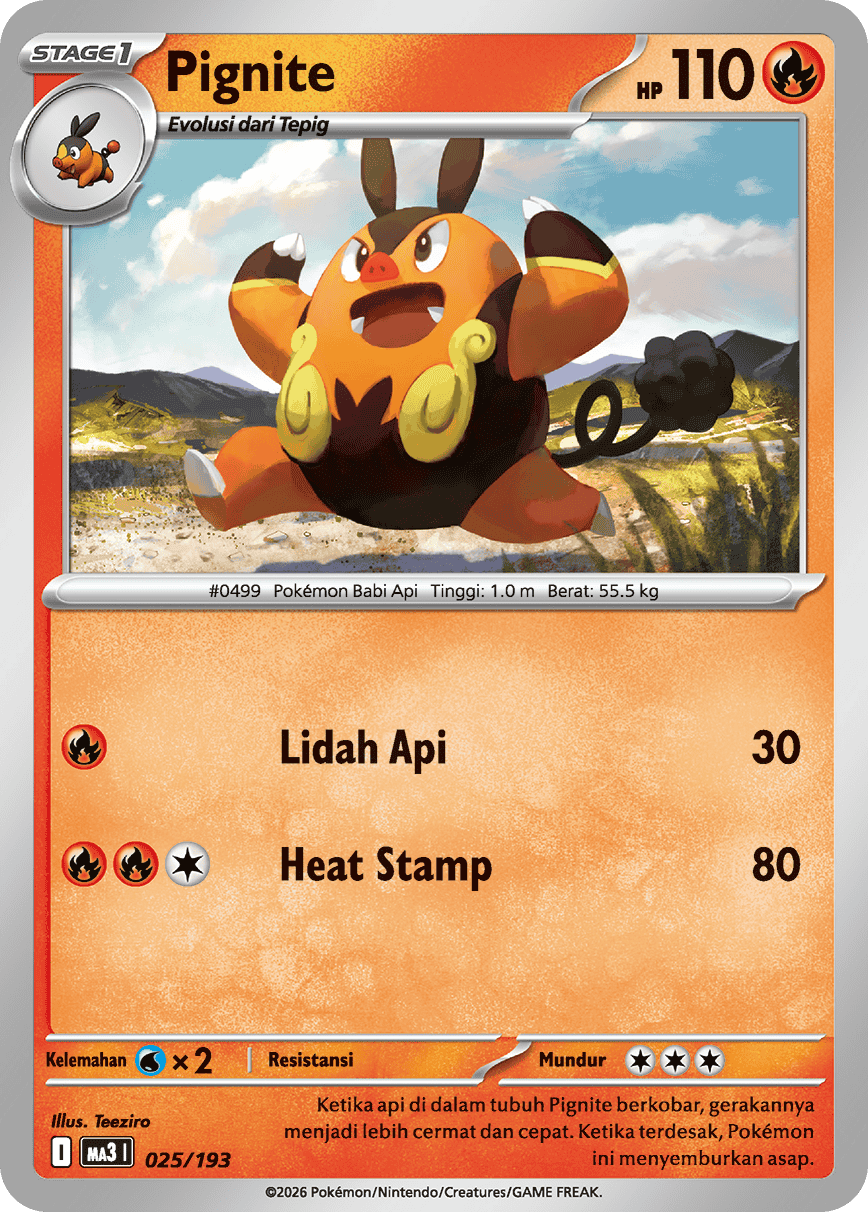 Ketika api di dalam tubuh Pignite berkobar, gerakannya menjadi lebih cermat dan cepat. Ketika terdesak, Pokémon ini menyemburkan asap.