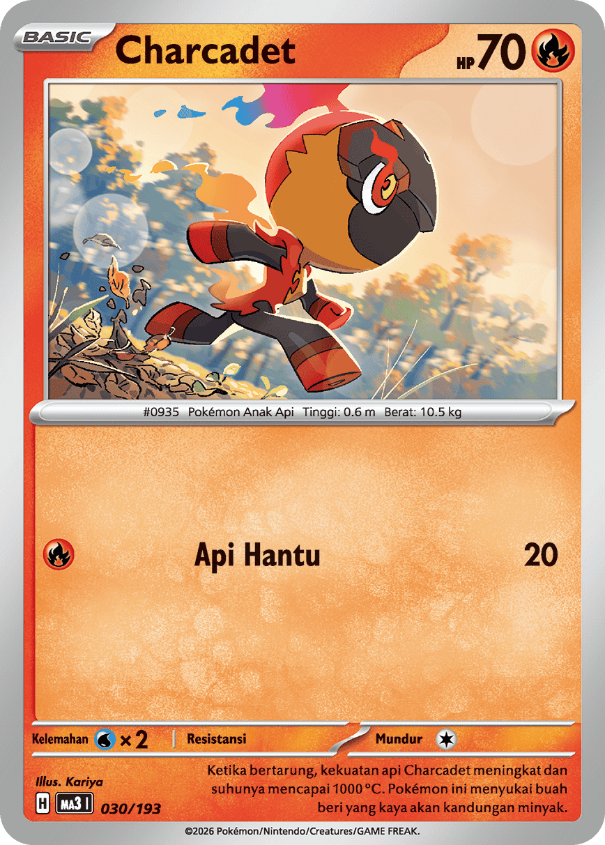 Ketika bertarung, kekuatan api Charcadet meningkat dan suhunya mencapai 1000 ℃. Pokémon ini menyukai buah beri yang kaya akan kandungan minyak.