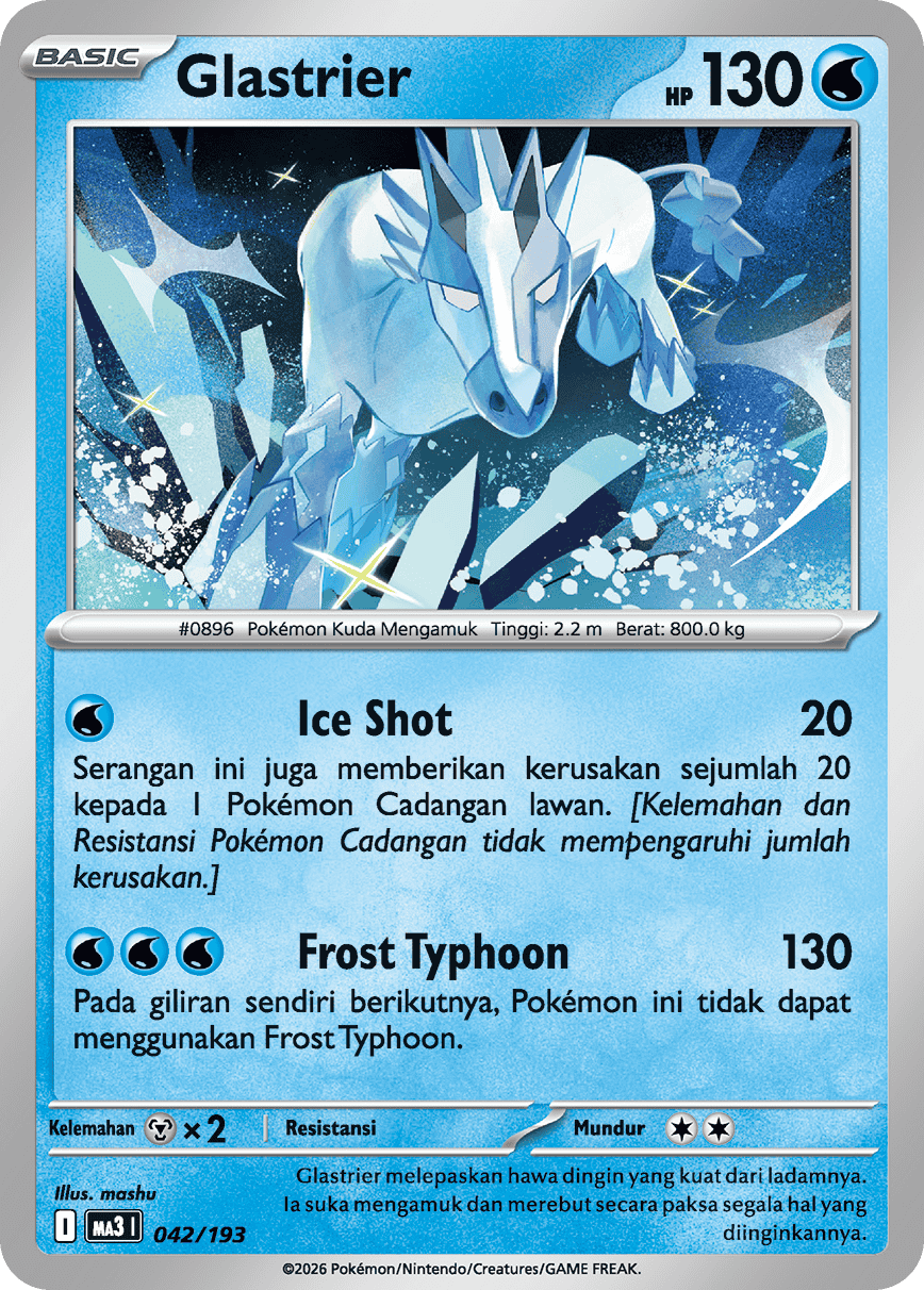 Glastrier melepaskan hawa dingin yang kuat dari ladamnya. Ia suka mengamuk dan merebut secara paksa segala hal yang diinginkannya.