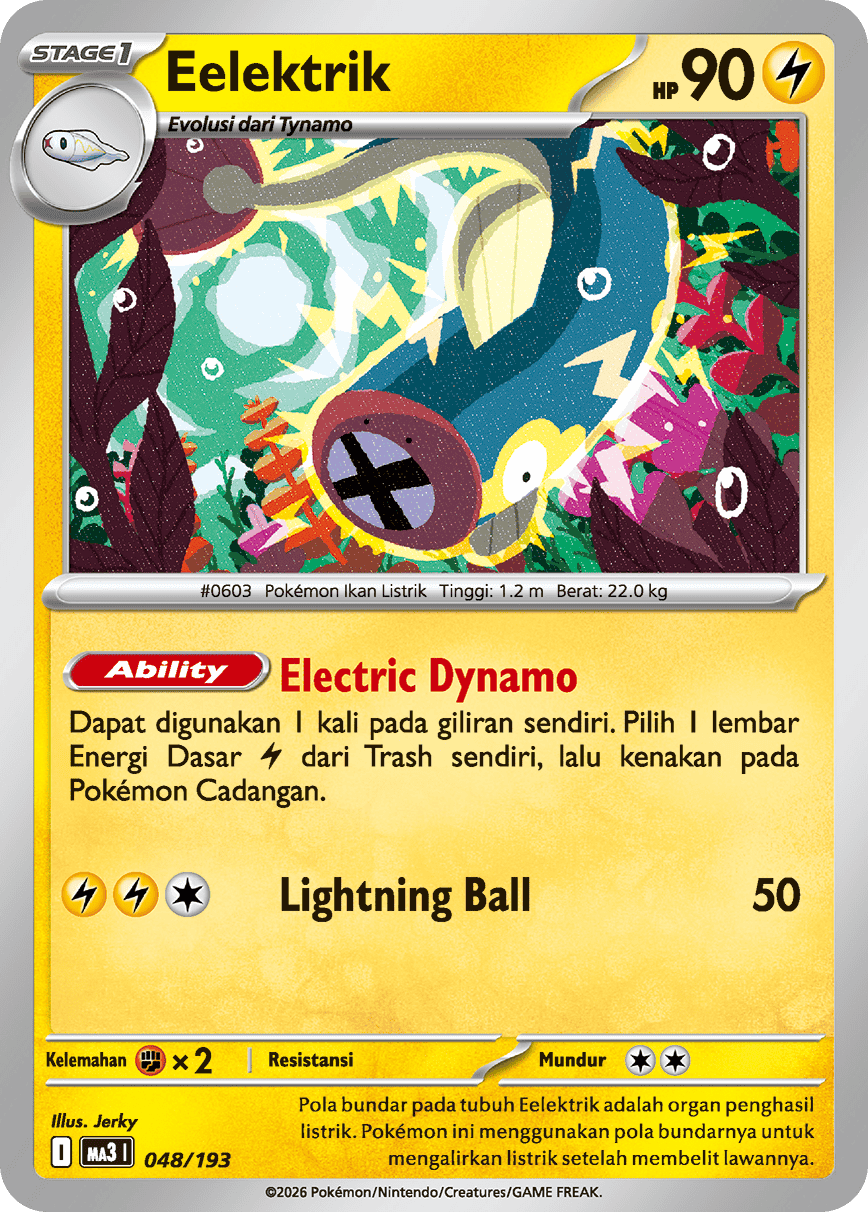 Dapat digunakan 1 kali pada giliran sendiri. Pilih 1 lembar Energi Dasar {Listrik} dari Trash sendiri, lalu kenakan pada Pokémon Cadangan.