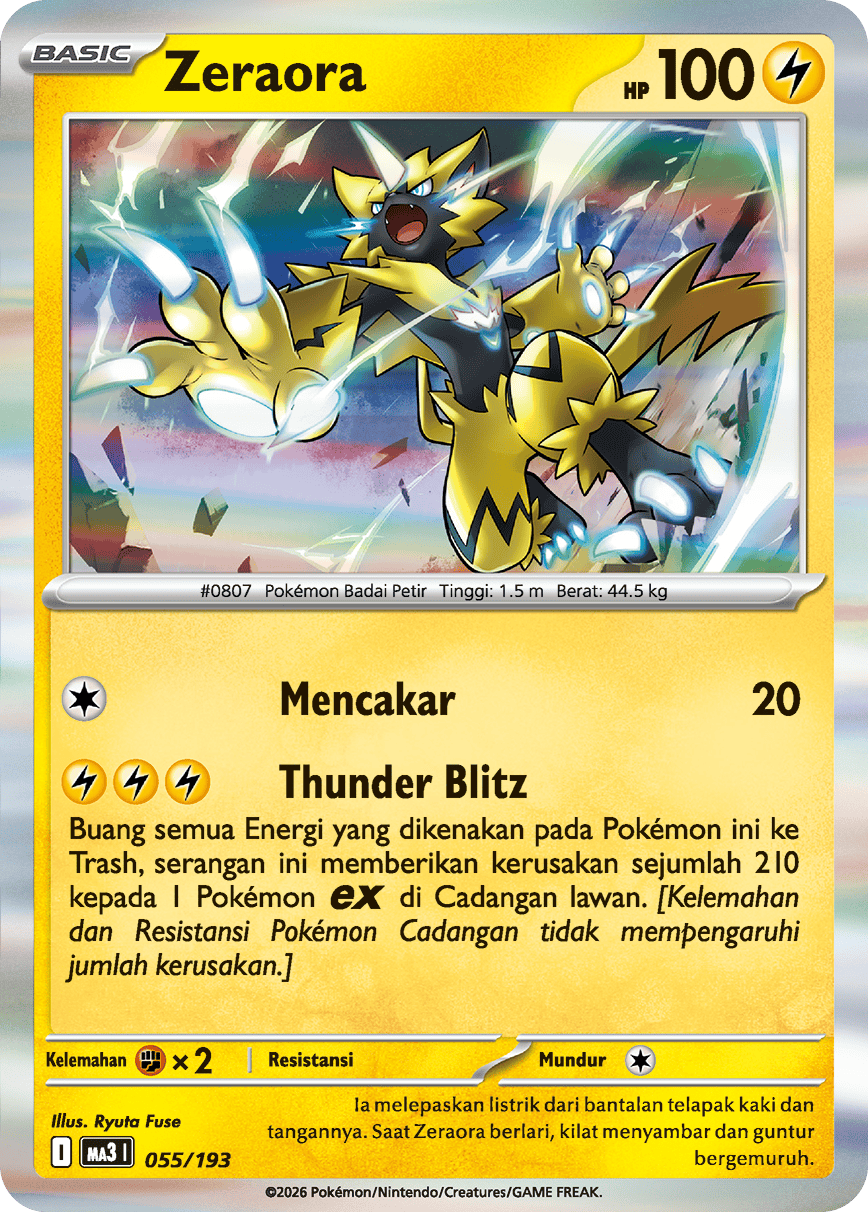 Ia melepaskan listrik dari bantalan telapak kaki dan tangannya. Saat Zeraora berlari, kilat menyambar dan guntur bergemuruh.