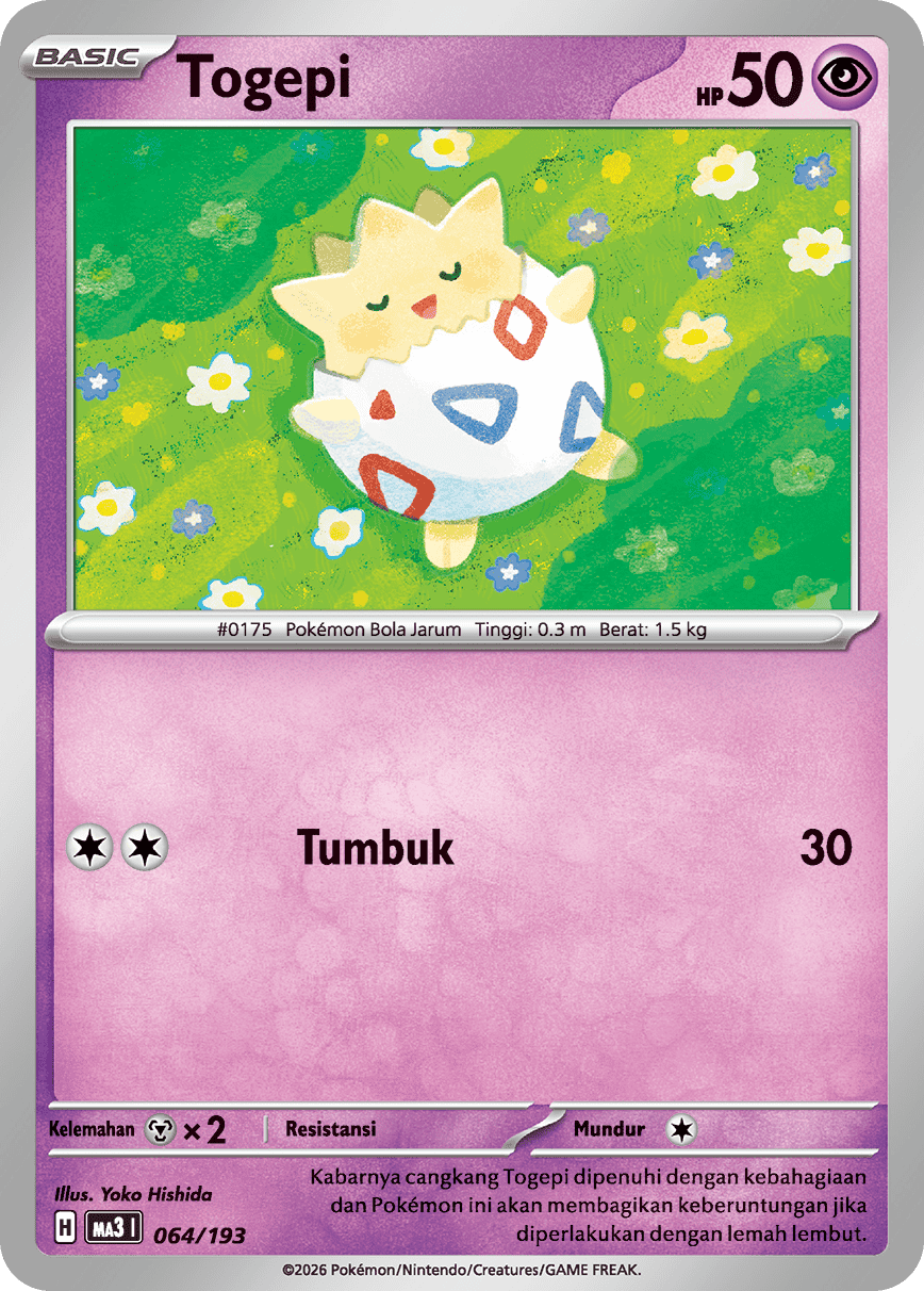 Kabarnya cangkang Togepi dipenuhi dengan kebahagiaan dan Pokémon ini akan membagikan keberuntungan jika diperlakukan dengan lemah lembut.