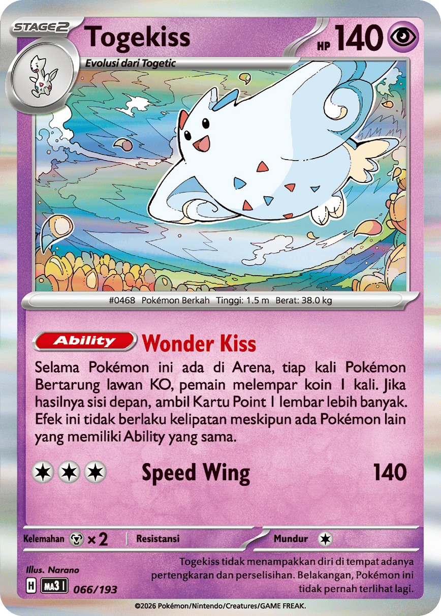 Selama Pokémon ini ada di Arena, tiap kali Pokémon Bertarung lawan KO, pemain melempar koin 1 kali. Jika hasilnya sisi depan, ambil Kartu Point 1 lembar lebih banyak. Efek ini tidak berlaku kelipatan meskipun ada Pokémon lain yang memiliki Ability yang sama.