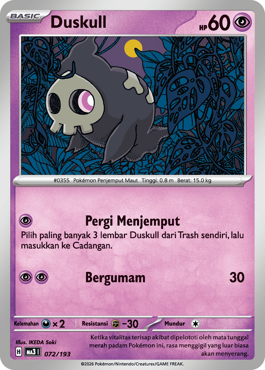 Pilih paling banyak 3 lembar Duskull dari Trash sendiri, lalu masukkan ke Cadangan.