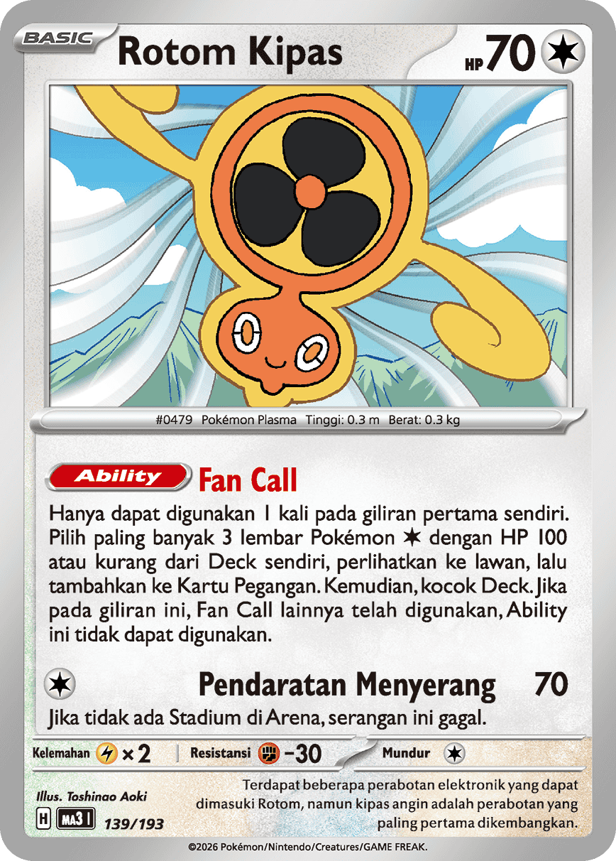 Hanya dapat digunakan 1 kali pada giliran pertama sendiri. Pilih paling banyak 3 lembar Pokémon {Bening} dengan HP 100 atau kurang dari Deck sendiri, perlihatkan ke lawan, lalu tambahkan ke Kartu Pegangan. Kemudian, kocok Deck. Jika pada giliran ini, Fan Call lainnya telah digunakan, Ability ini tidak dapat digunakan.