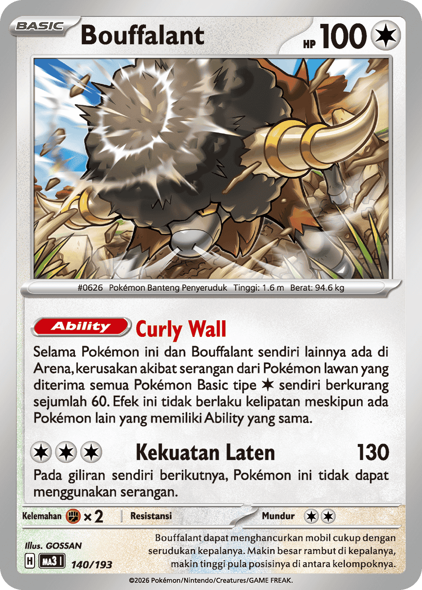 Selama Pokémon ini dan Bouffalant sendiri lainnya ada di Arena, kerusakan akibat serangan dari Pokémon lawan yang diterima semua Pokémon Basic tipe {Bening} sendiri berkurang sejumlah 60. Efek ini tidak berlaku kelipatan meskipun ada Pokémon lain yang memiliki Ability yang sama.