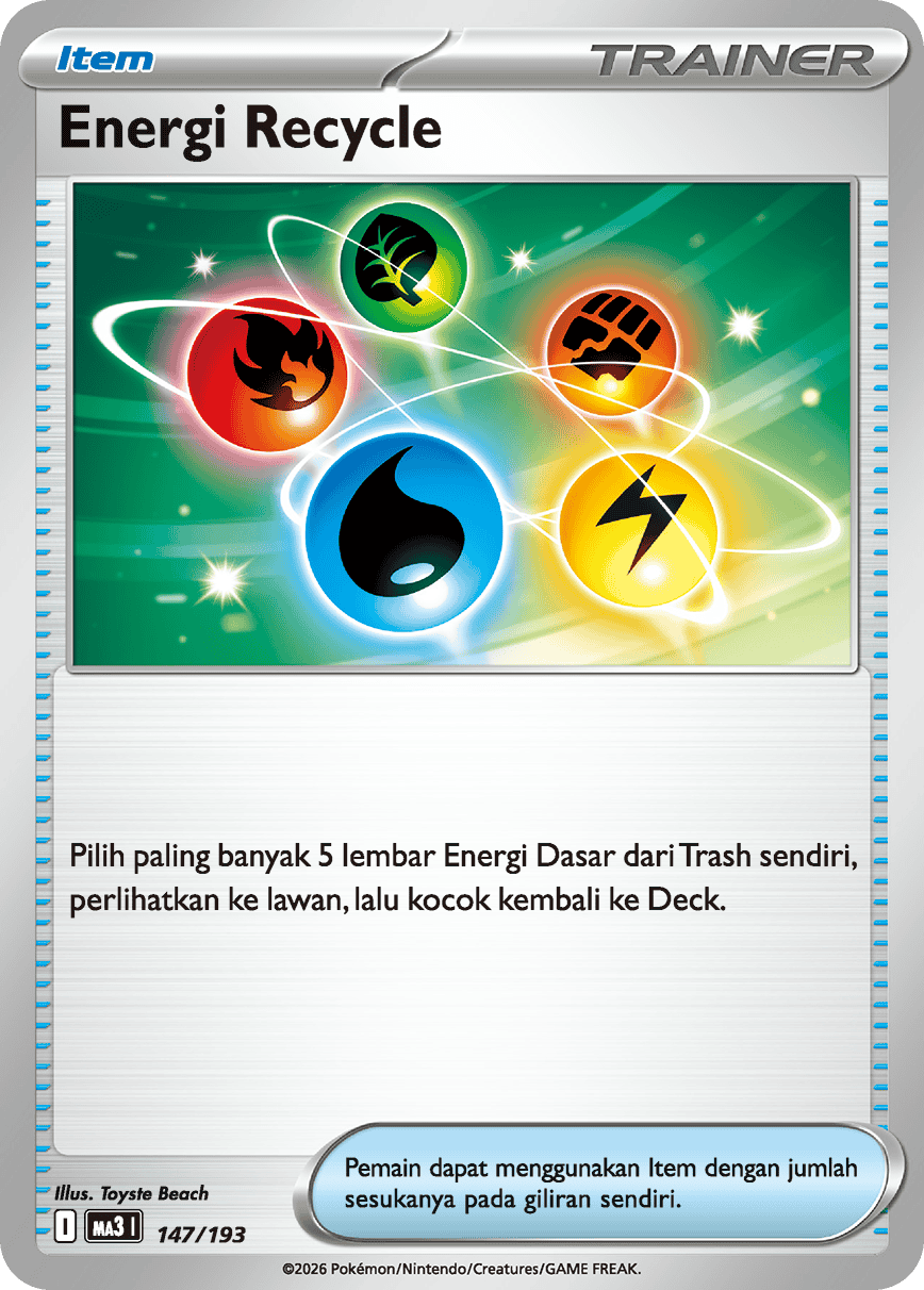 Pilih paling banyak 5 lembar Energi Dasar dari Trash sendiri, perlihatkan ke lawan, lalu kocok kembali ke Deck.