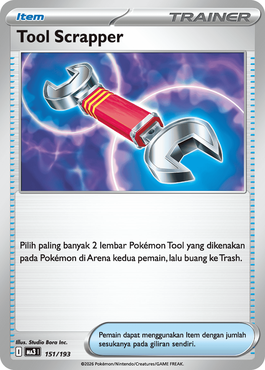 Pilih paling banyak 2 lembar Pokémon Tool yang dikenakan pada Pokémon di Arena kedua pemain, lalu buang ke Trash.