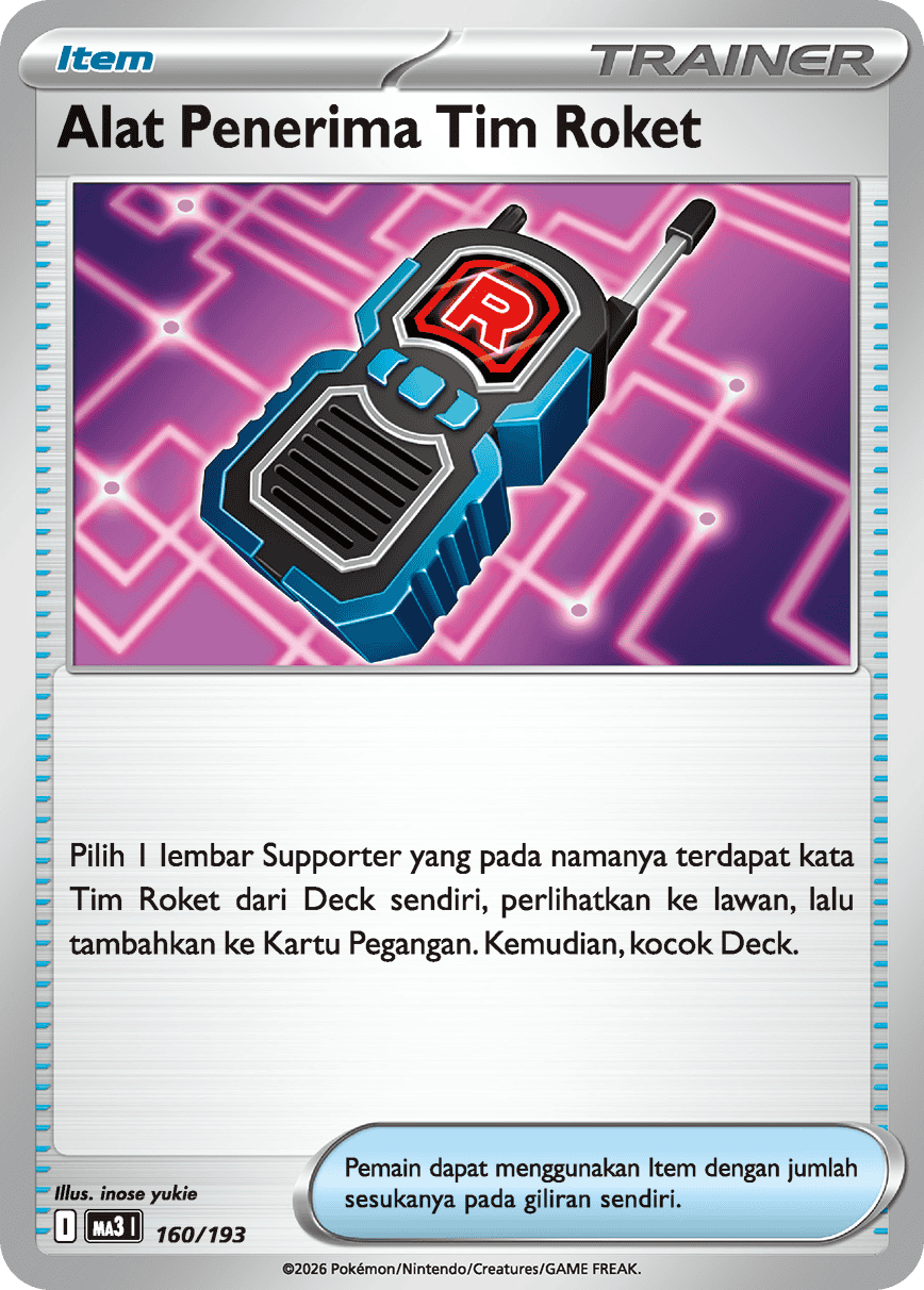 Pilih 1 lembar Supporter yang pada namanya terdapat kata Tim Roket dari Deck sendiri, perlihatkan ke lawan, lalu tambahkan ke Kartu Pegangan. Kemudian, kocok Deck.