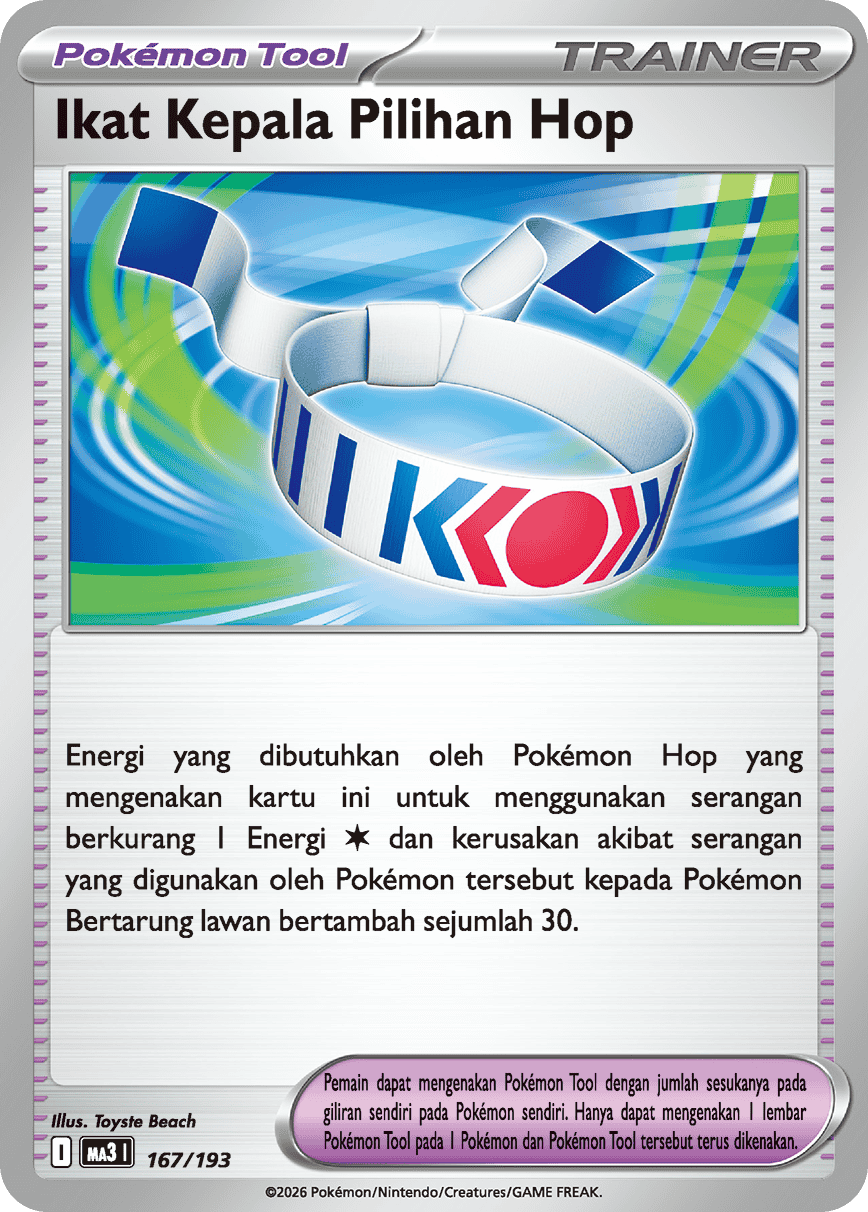 Energi yang dibutuhkan oleh Pokémon Hop yang mengenakan kartu ini untuk menggunakan serangan berkurang 1 Energi {Bening} dan kerusakan akibat serangan yang digunakan oleh Pokémon tersebut kepada Pokémon Bertarung lawan bertambah sejumlah 30.